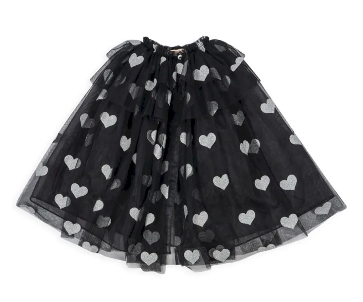 Lanza un hechizo con estilo y conviértete en la bruja más brillante con esta preciosa capa de tul negra con corazoncitos plateados de purpurina.