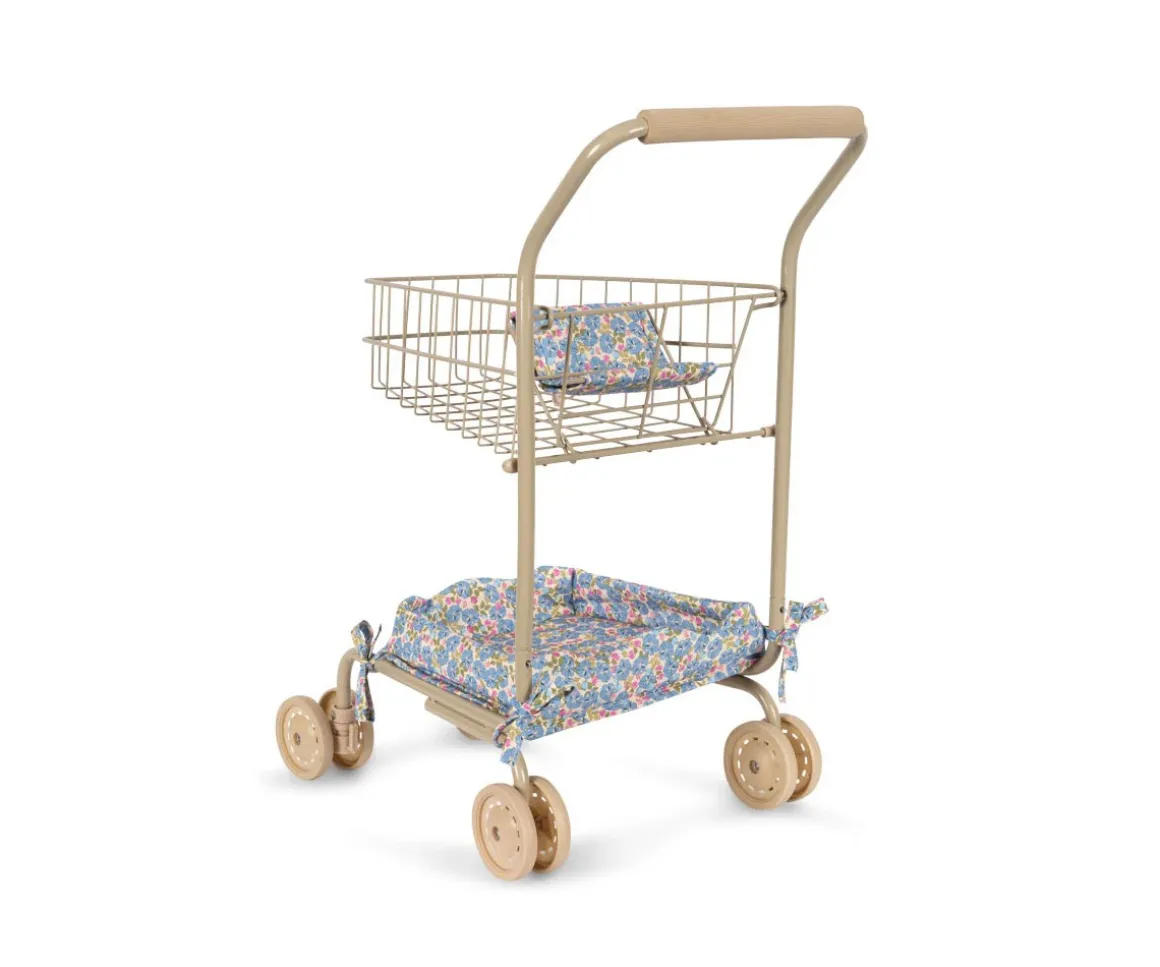 Original carrito de compras con un bonito estampado de flores, con ruedas delanteras giratorias, cestita de gran capacidad y bandeja inferior de tela para que los pequeños compradores puedan almacenar todos sus artículos de compra. En la bandeja superior dispone de un asiento para colocar al muñeco