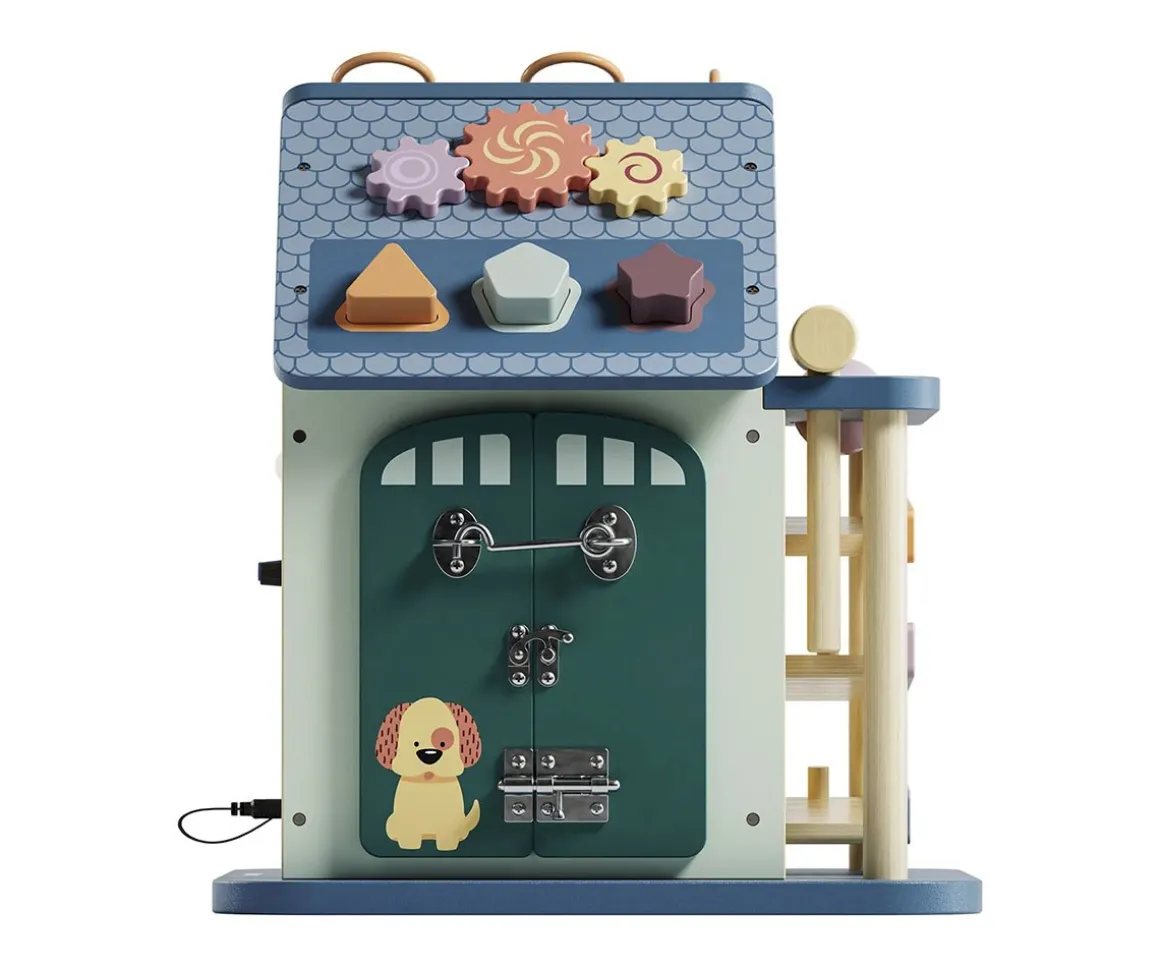 - Incluye: casa de actividades con 12 opciones de juego, 1 martillo, 1 pelota y 6 formas para ordenar y atornillar