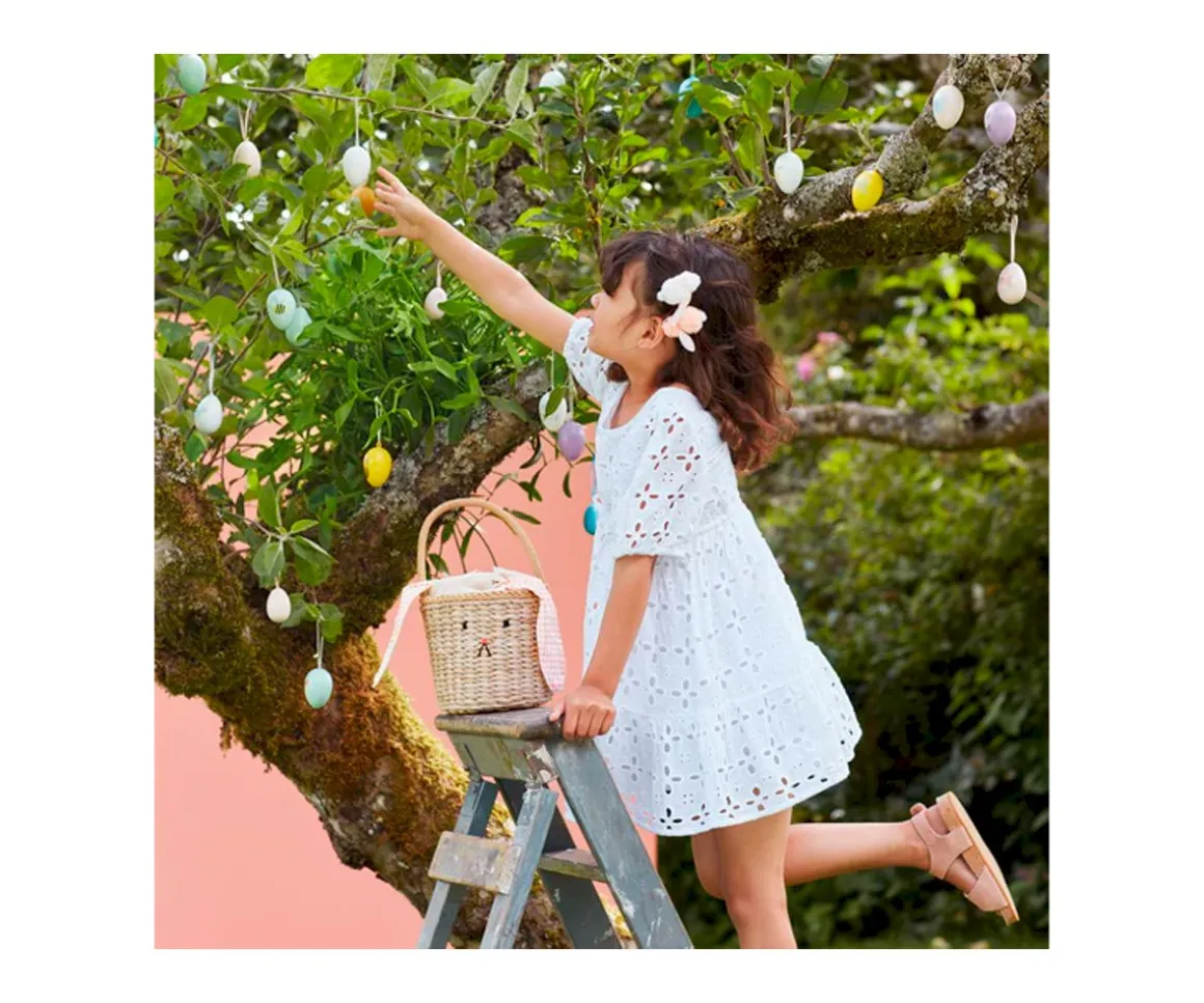 Original cesta de paja con una dulce carita de conejito. Está forrada de algodón a cuadros, tiene divertidas orejas flexibles y una linda cola de pompón.