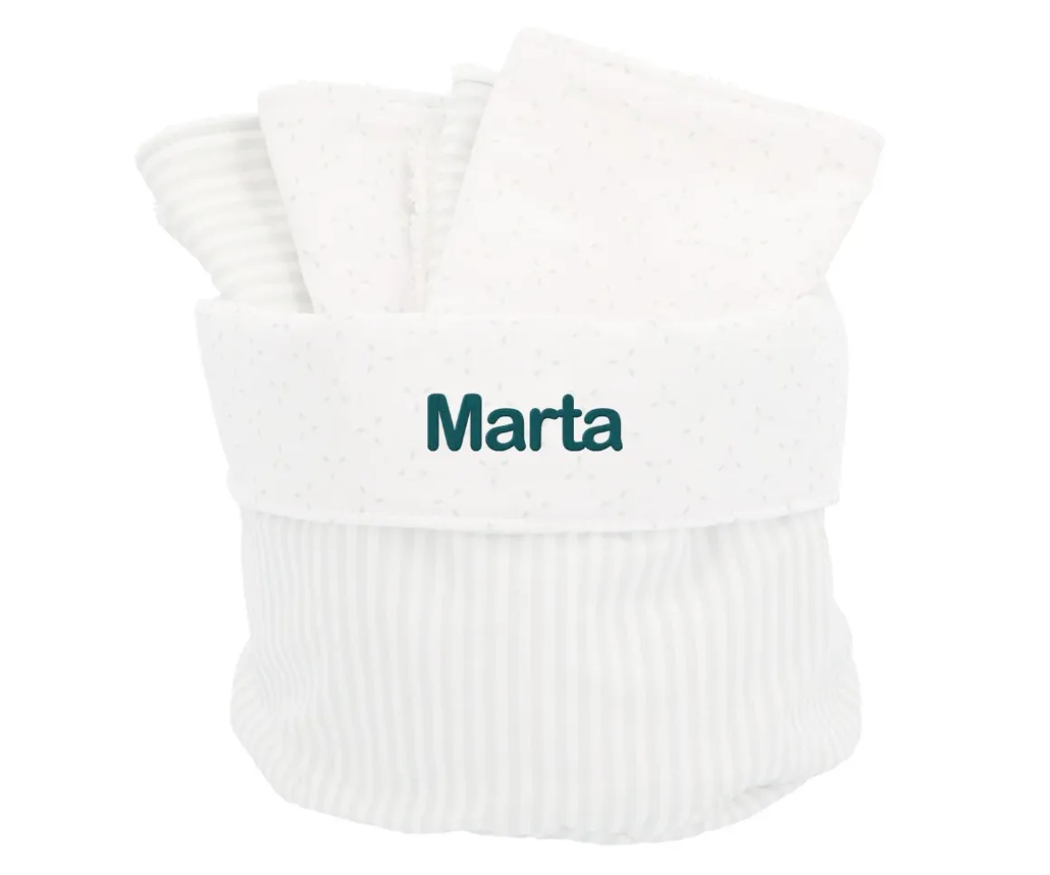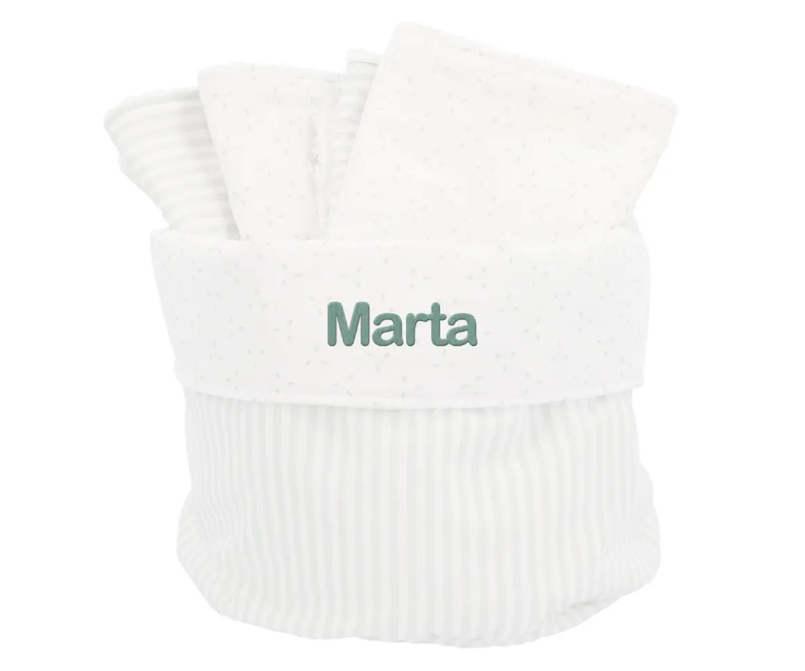 Cesta organizadora de tamaño pequeño para poder colocar y tener a mano, las cremitas y los pañales del bebé. Incluye 4 toallitas secababitas a juego con la colección Dorset Verde.