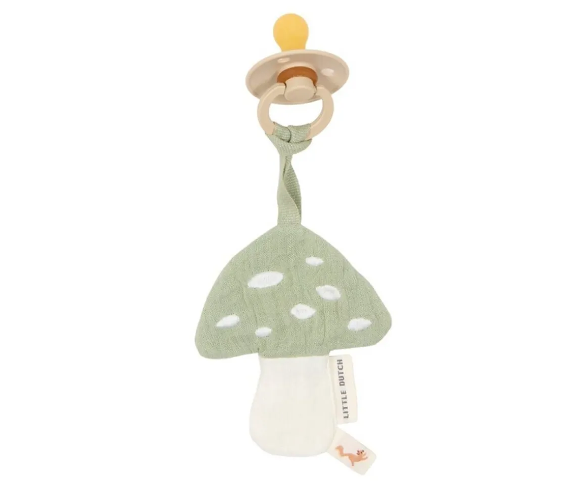 Bonito y original chupetero en forma de seta con textura suave en tono beige y sage de Little Dutch, perfecto para regalar a un bebé.