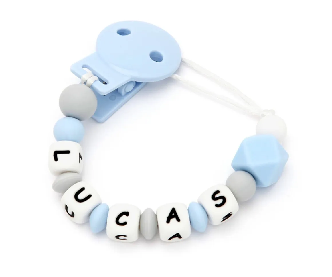 Chupetero 100% mordisqueable de Silicona alimentaria antibacteriana, personalizable con el nombre del bebé para que sea una pieza única y original.