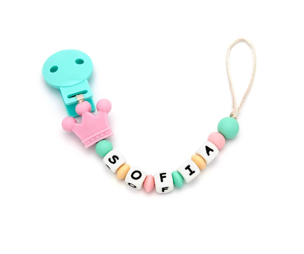 Chupetero 100% mordisqueable de Silicona alimentaria antibacteriana, personalizable con el nombre del bebé para que sea una pieza única y original.