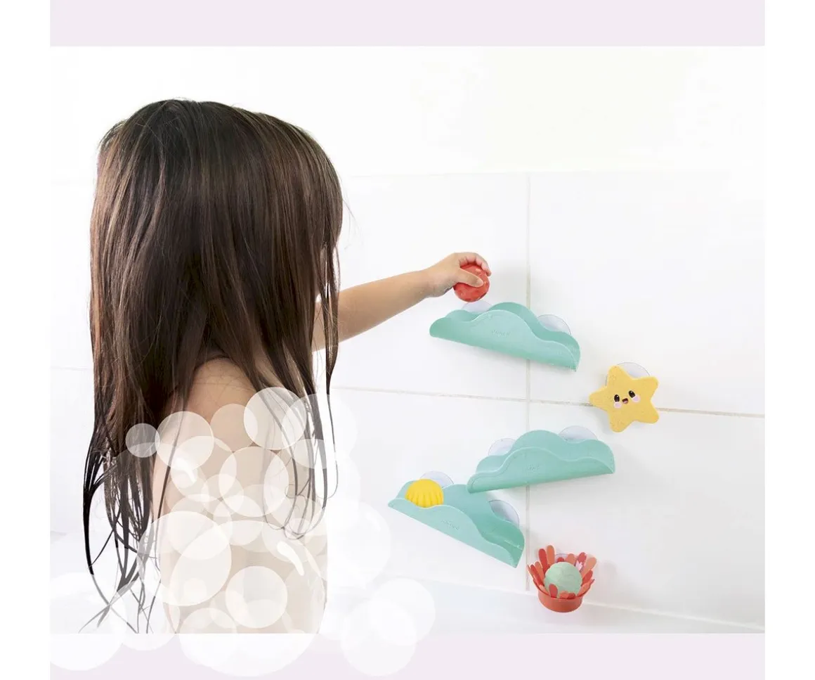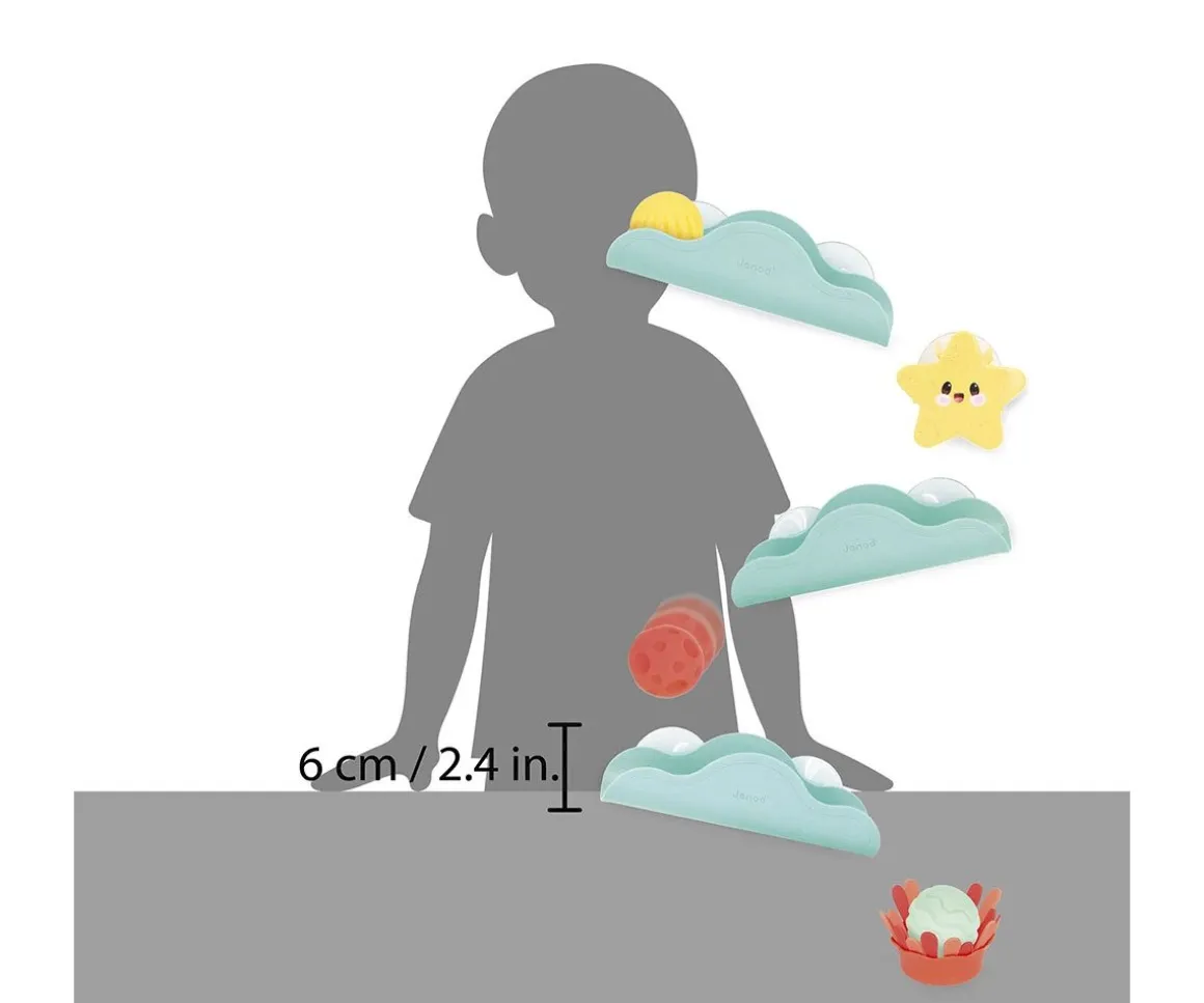 3 toboganes, 3 bolas sensoriales, 1 estrella de mar giratoria y 1 anémona marina. Todas poseen ventosas para poder fijarlas y crear un divertido circuito para que los peques dejen caer las bolas.