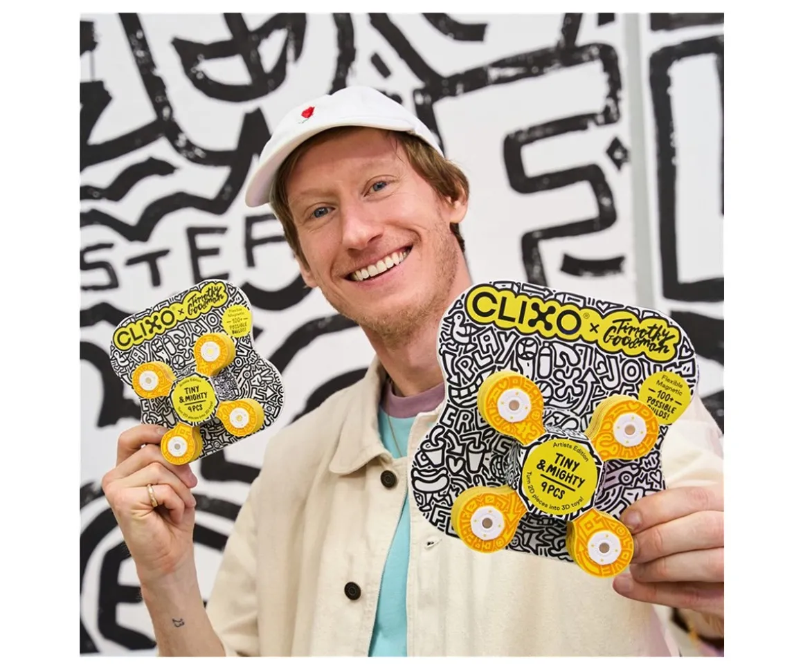 Esta edición especial Clixo x Timothy Goodman, incluye gráficos y colores diseñados por el artista y une el poder de la construcción magnética flexible con un diseño único.