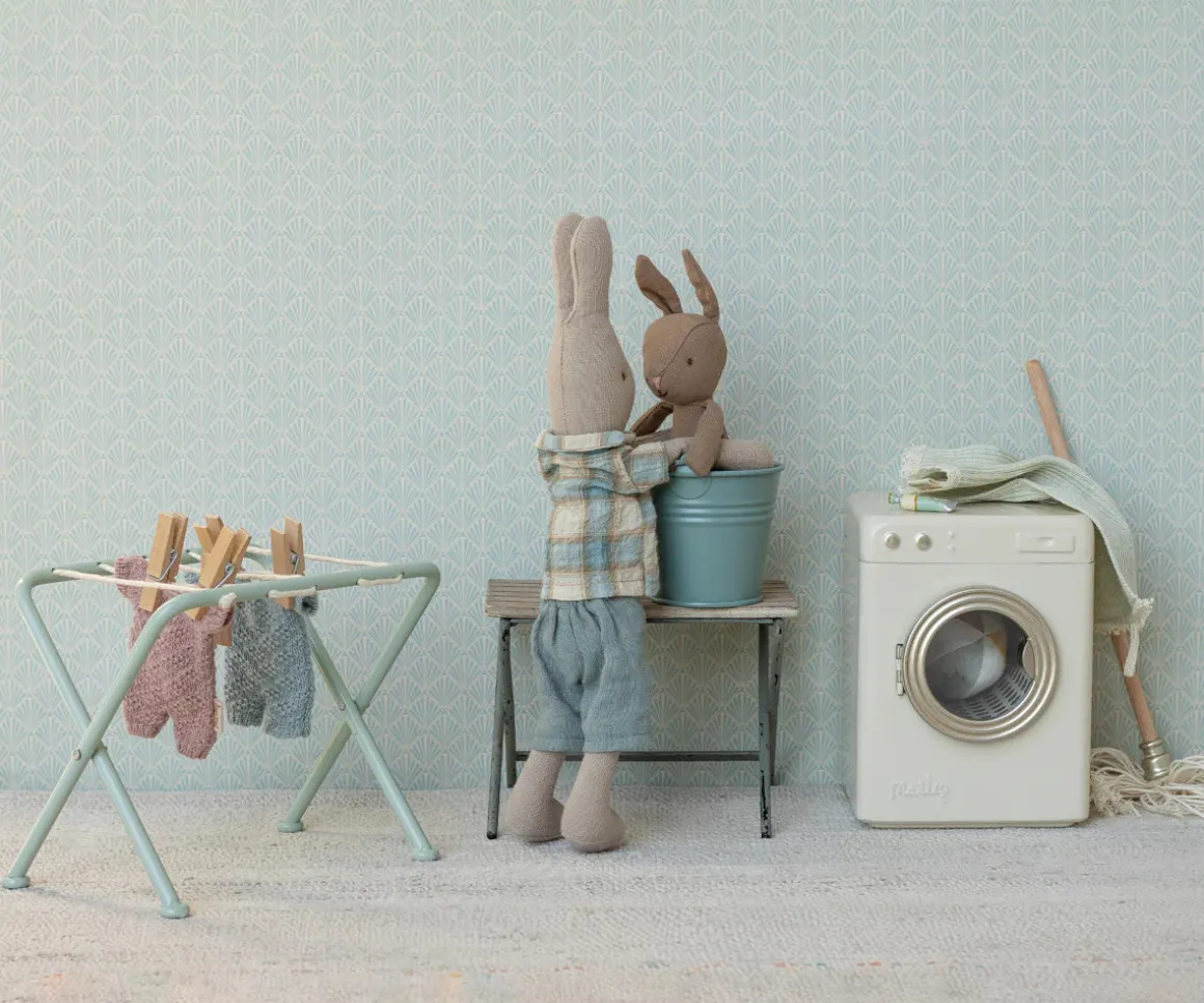 Est pequeño conejito lleva puesto un traje de punto azul y es perfecto para los accesorios Maileg de tamaño micro.