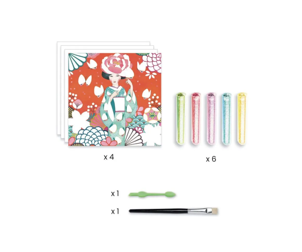 - Incluye 4 láminas, 6 tubos de purpurina, pincel espátula y folleto