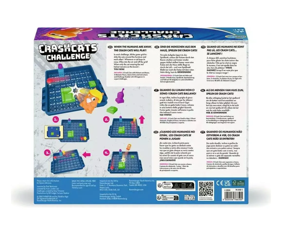 - Incluye: 2 Crash Cat con cascos y bases, 5 piezas de obstáculo, 1 pista, 1 libro de instrucciones y libro de 40 retos