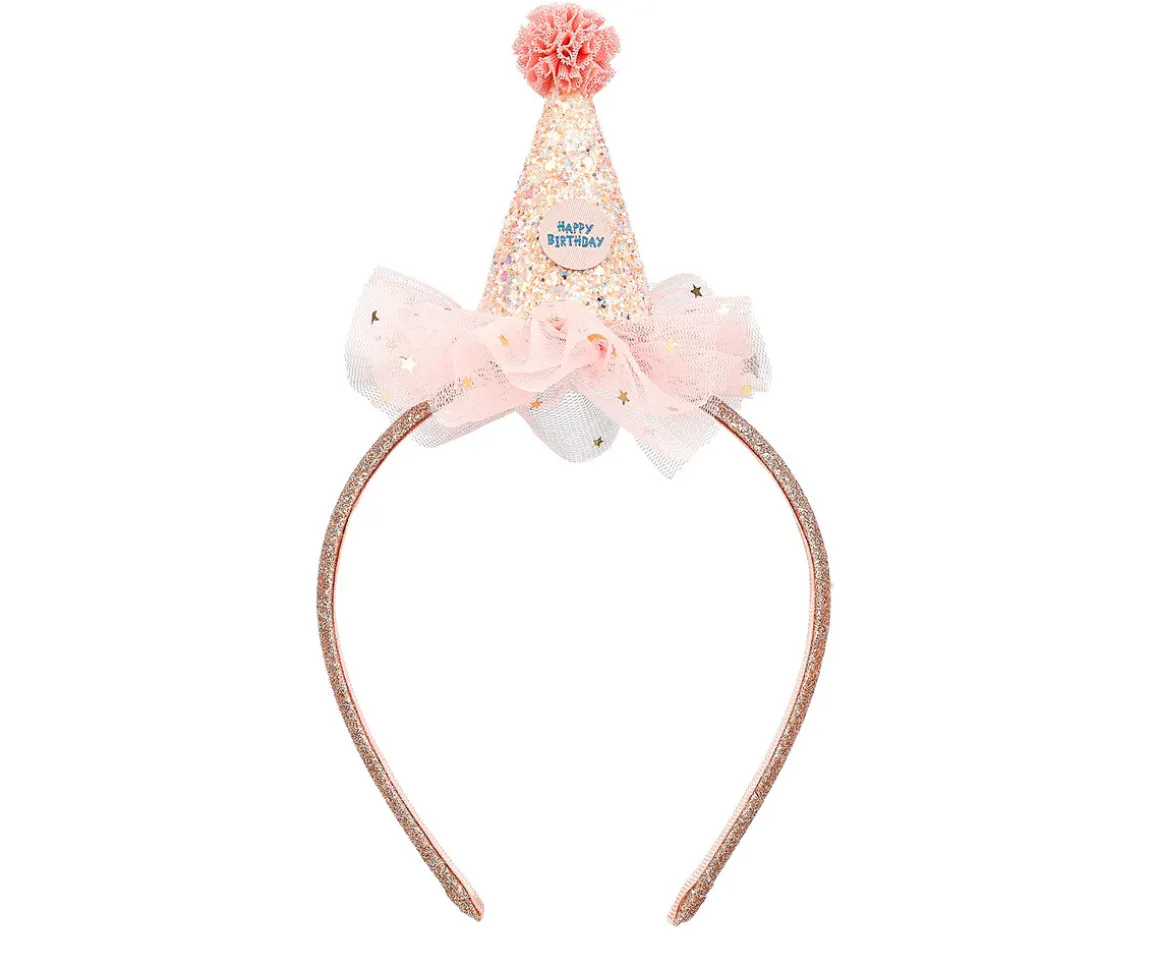 Esta encantadora corona de fiesta de cumpleaños incluye un gorrito con purpurina y tul, perfectos para la ocasión.