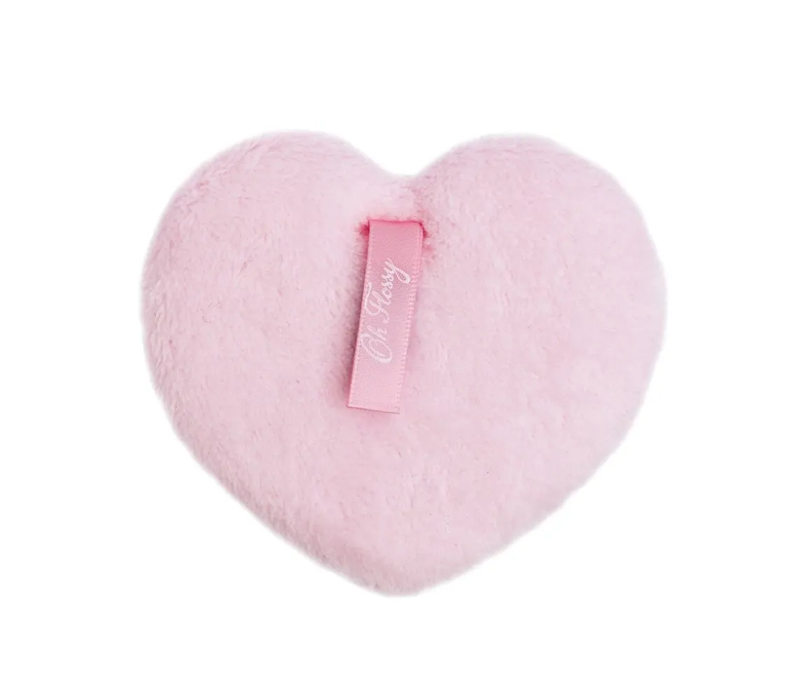 Almohadilla desmaquillante reutilizable de Oh Flossy en forma de corazón rosa. Hecha 100% de algodón de microfibra, sin químicos, vegana y apta para todo tipo de piel. Incluye una etiqueta para colgar y secar tras el lavado.
