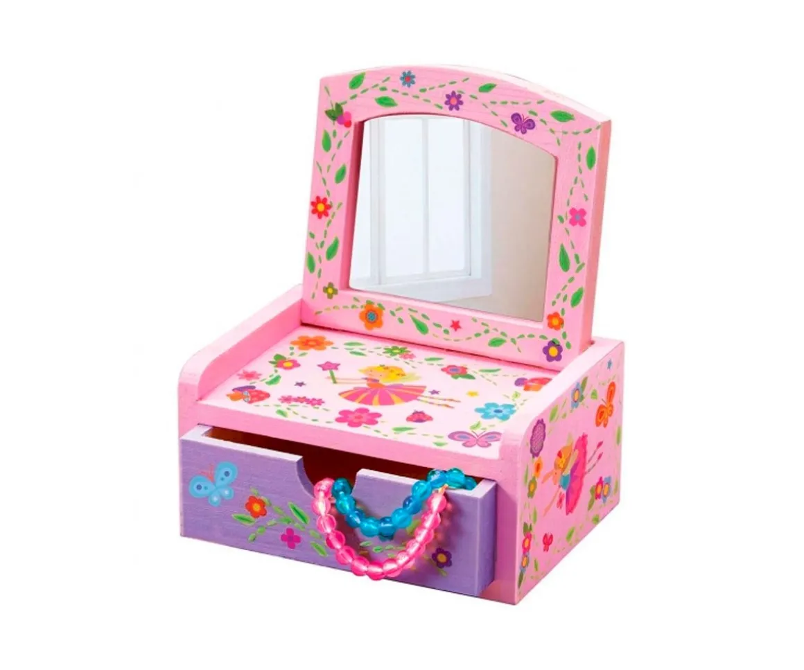 Podrás decorar este joyero de madera con pintura y bonitas pegatinas de haditas.