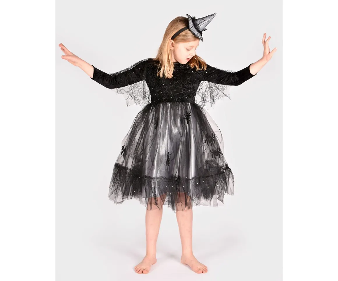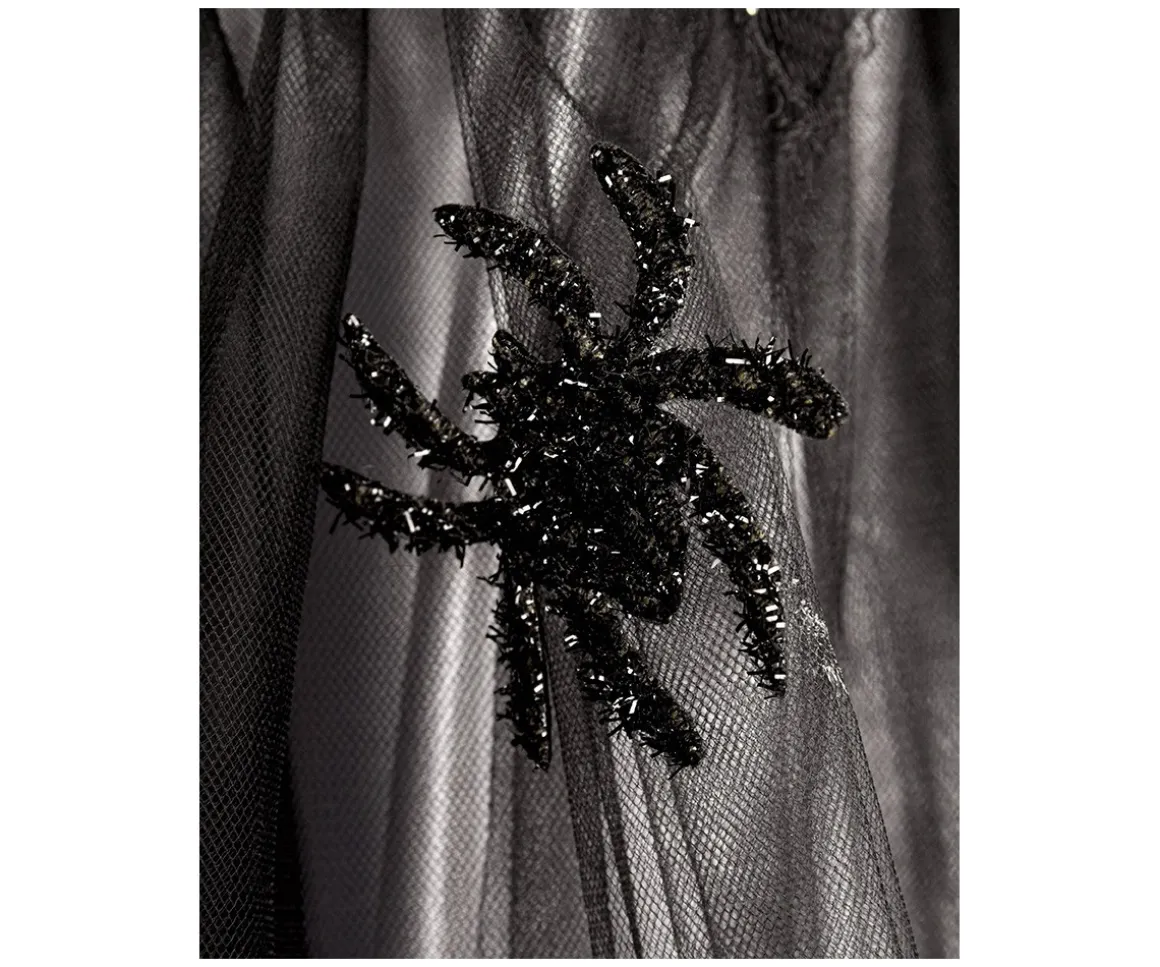 La parte superior del vestido está confeccionada en terciopelo negro suave con una bolero cosido en forma de telaraña brillante, decorado con pequeñas piedras plateadas. La falda está formada por dos capas: una falda inferior de satén plateado y una sobrefalda de gasa negra con adorables detalles de arañas brillantes.