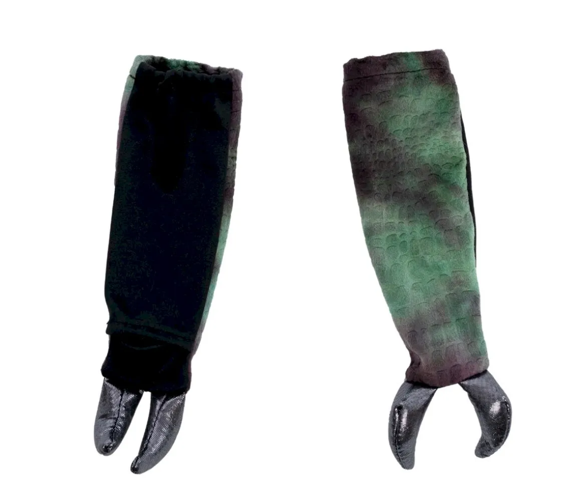 La capa tie-dye es verde, gris y morada con un forro negro. Decorada con púas metálicas grises y moradas en la espalda. La cabeza de dinosaurio tiene una boquilla extraíble para garantizar un ajuste seguro.