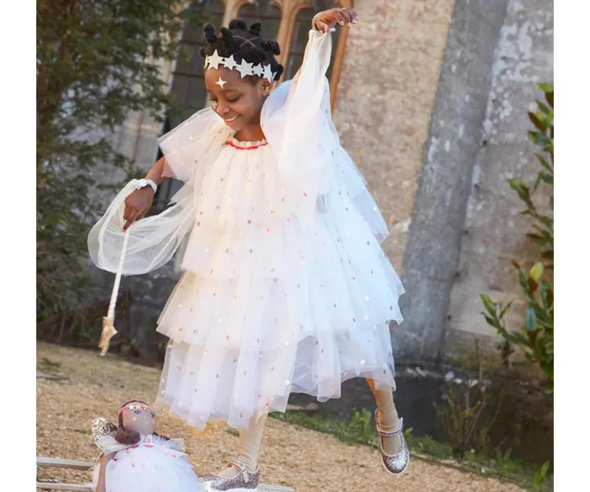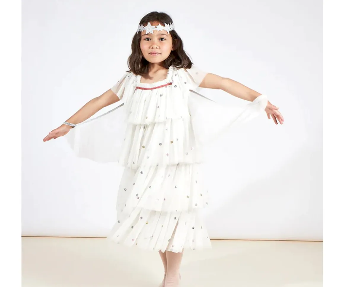 Transforma a tus peques en hermosos Ángeles de Navidad con este encantador disfraz. Perfecto para obras de teatro, fiestas y disfraces, para pasar horas de diversión e imaginación. Cuenta con un dulce tul con lentejuelas, con alas desmontables y una diadema de estrellas con purpurina plateada.