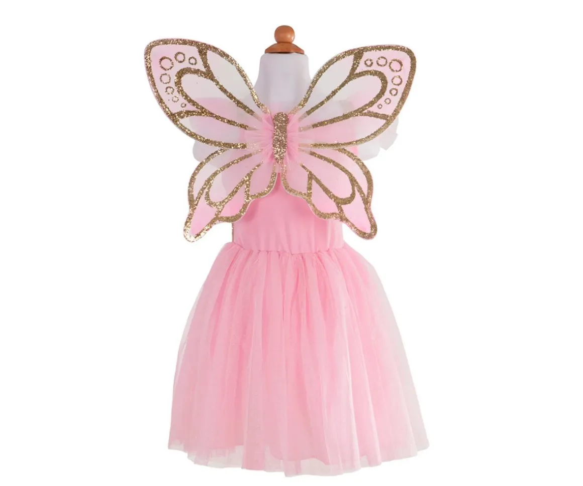 Los peques se convertirán en preciosas mariposas doradas con este disfaz brillante.Está formado por dos piezas, el tul rosa que forma una falda amplia que combina con top de lentejuelas doradas y unas relucientes alas con purpurina estampada.