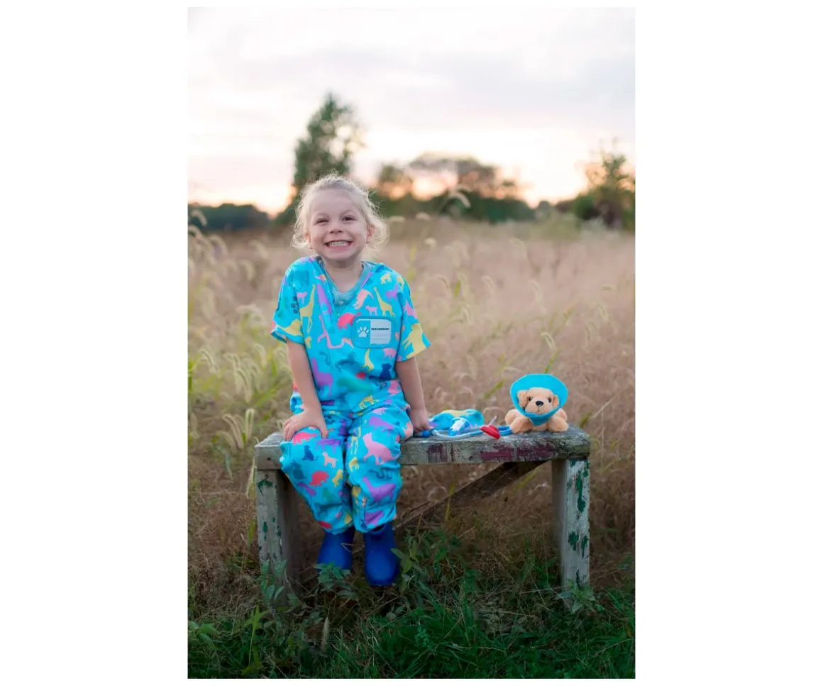 Este adorable disfraz de veterinario formado por una camisa y pantalones, máscara, cachorro de peluche con cono extraíble, jeringa con émbolo que funciona, telescopio y una tarjeta de identificación.