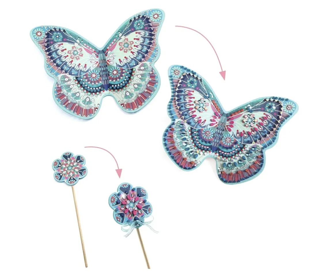 Fabuloso kit DIY Djeco, para crear unas alas de hada y una varita mágica con preciosas pegatinas y diamantes brillantes. Las alas pueden llevarse en la espalda, convirtiéndose en un complemento ideal para fiestas de disfraces.