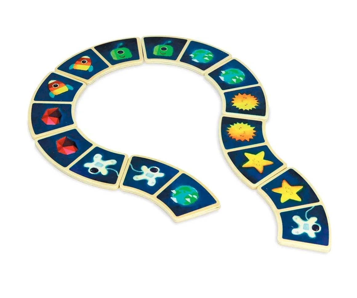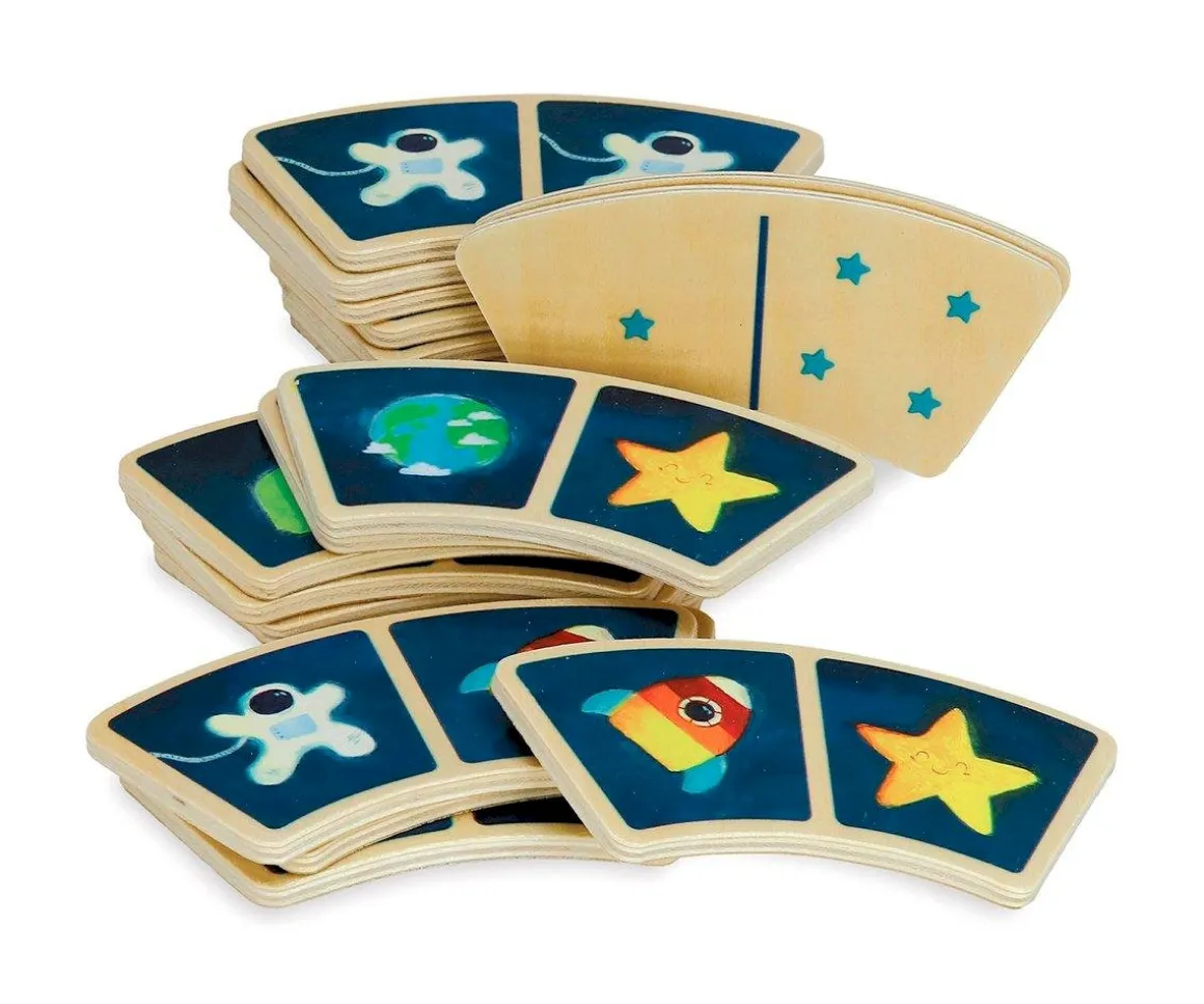 Este dominó está compuesto por 28 piezas de madera decoradas con la temática ?el espacio? y detrás de cada una de las piezas estrellas pequeñitas para que el peque practique contando.