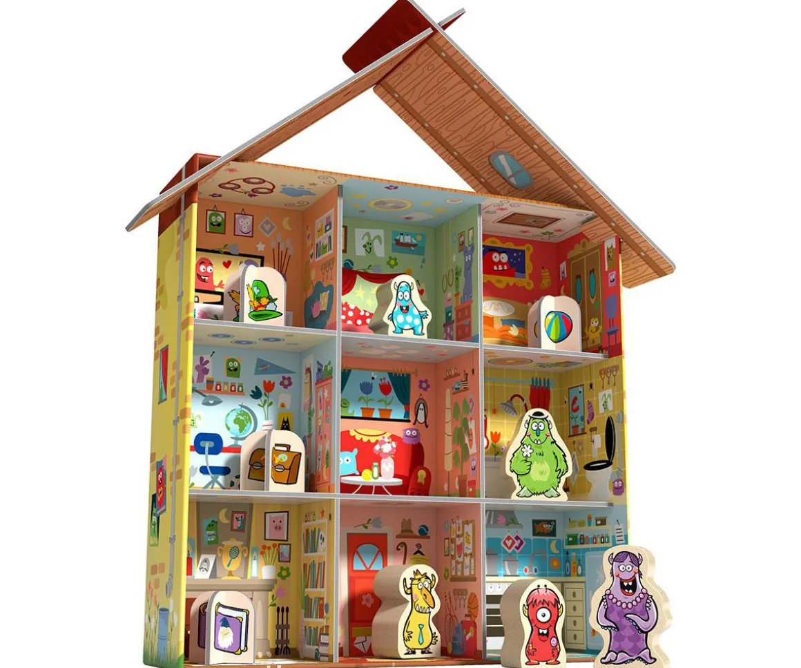 - Incluye: 1 caja con ilustraciones, 1 cuadrícula (dividida por 4 piezas), 1 tejado compuesto de 2 piezas, 5 monstruos, 4 objetos favoritos, 1 cuaderno de anillas con 60 retos y sus correspondientes soluciones e instrucciones del juego