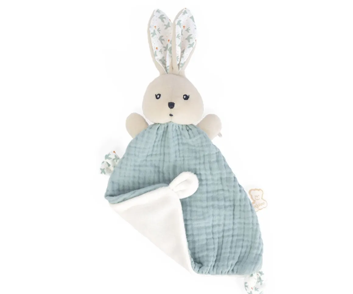 Tierno conejito de peluche doudou con largas orejas y pequeños piececitos fáciles de agarrar que les encantará a los más pequeños de la casa. Su cuerpo es por un lado suave y por el otro blandito