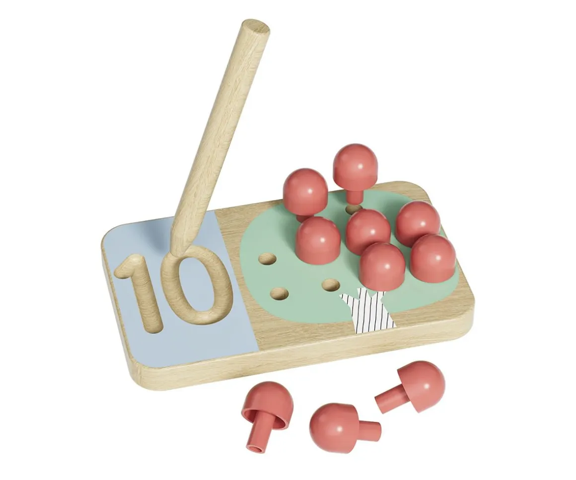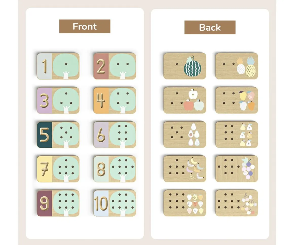 - Incluye: 10 tableros de madera con números de 1 al 10, 55 pequeños pinchos (manzanas), 1 lápiz de madera y base