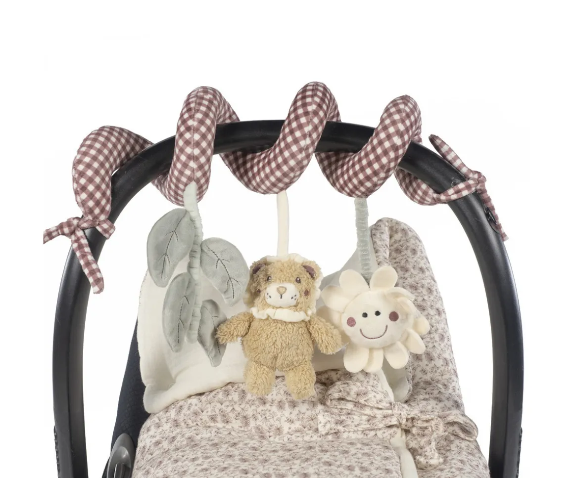 La espiral de actividades tiene una adorable cabeza de león en un extremo y decorada con la colección Gala Cerise de Walking Mum, es ideal para estimular y entretener a tu bebé. Confeccionado en materiales suaves y seguros, se adapta fácilmente a cochecitos o sillas de auto. Incluye colgantes con texturas, formas y sonidos que fomentan el desarrollo sensorial.