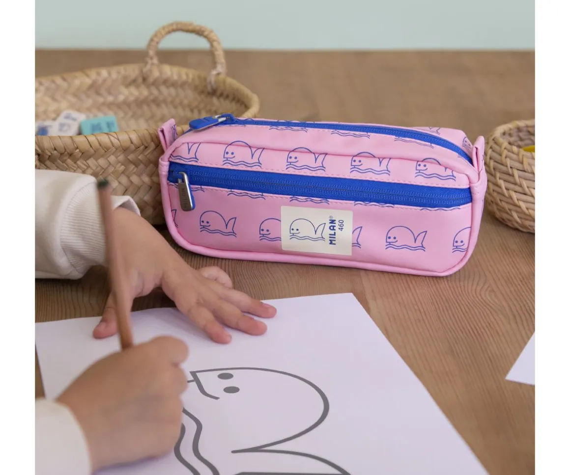 Estuche rectangular de la colección 460 Since 1918 de MILAN perfecto para acompañar a los peques en su día a día escolar. Incluye dos compartimentos con cremallera azul, uno principal y un práctico bolsillo frontal, ideales para mantener lápices, bolígrafos, gomas y pequeños accesorios bien organizados.
