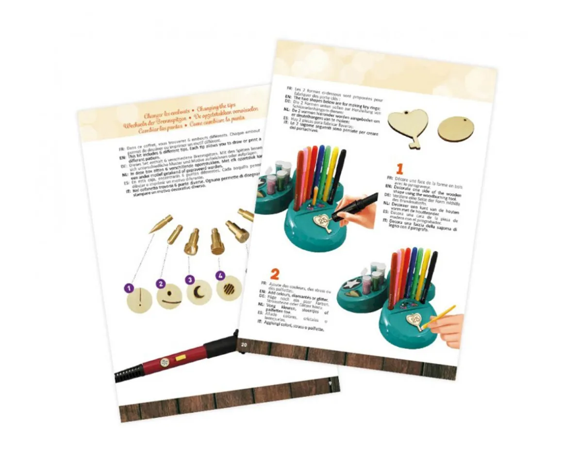 La herramienta para madera cuenta con protección contra quemaduras, termostato y botón de encendido/apagado. Los adultos pueden usar pinzas para cambiar entre las 6 puntas de grabado.