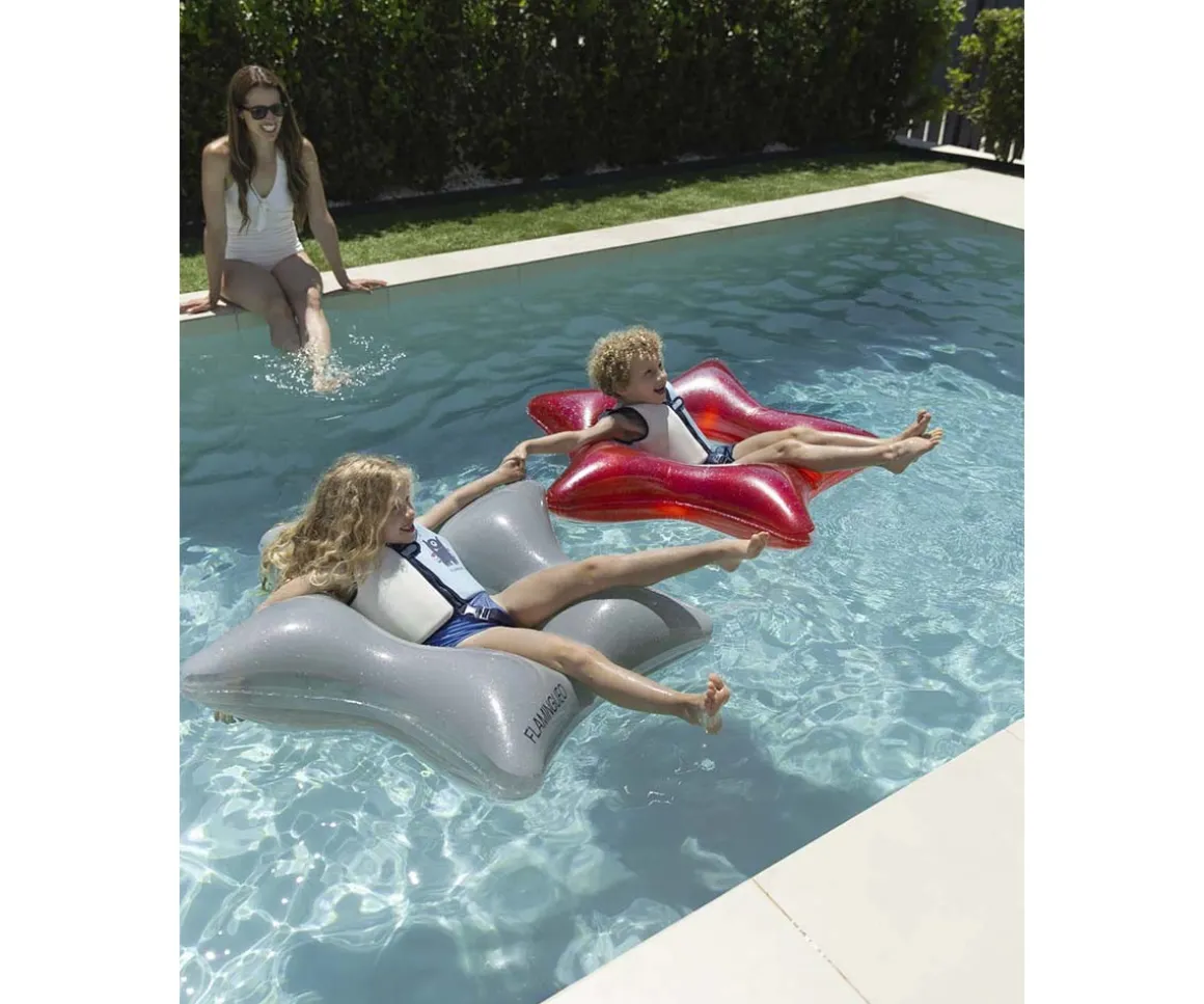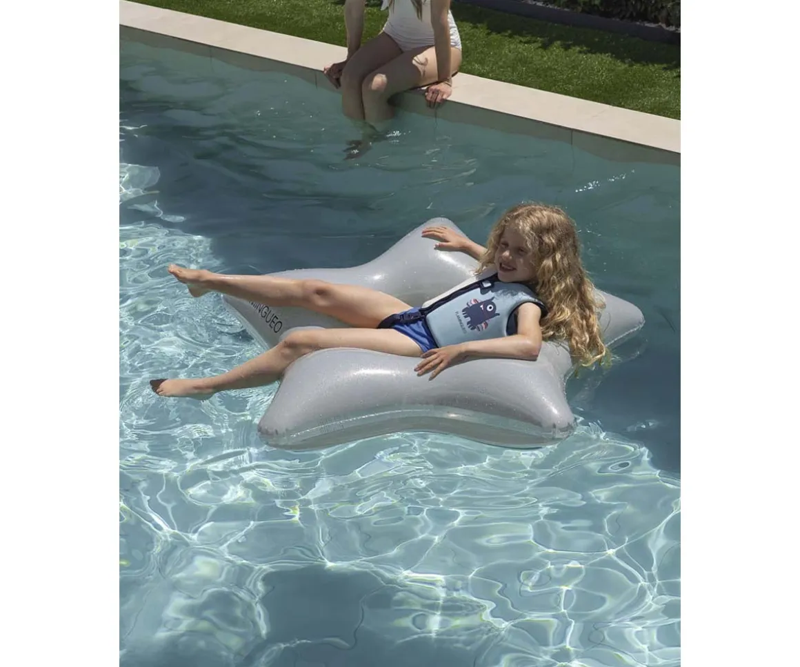 Un verano de lo más original, con el flotador en forma de estrella Vega en color plata y reflejo con purpurina. El accesorio perfecto para compartir con amigos en la playa o en la piscina.