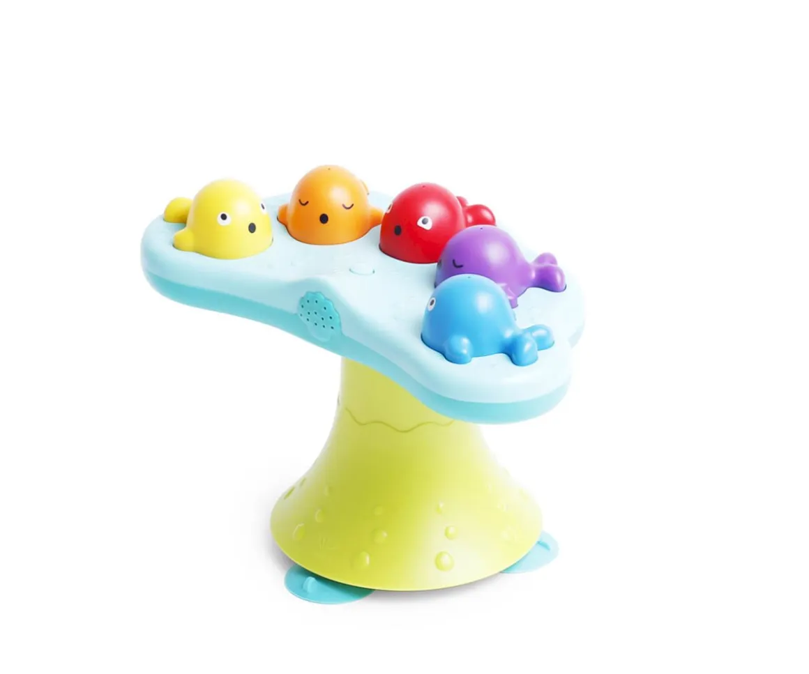 Divertida fuente musical con ballenas de 5 colores diferentes. Un juego de baño donde podrán divertirse viendo cómo las ballenas tiran agua y bailar al ritmo musical que a la misma vez podrás apretar a las ballenas como si estuvieras tocando un piano.