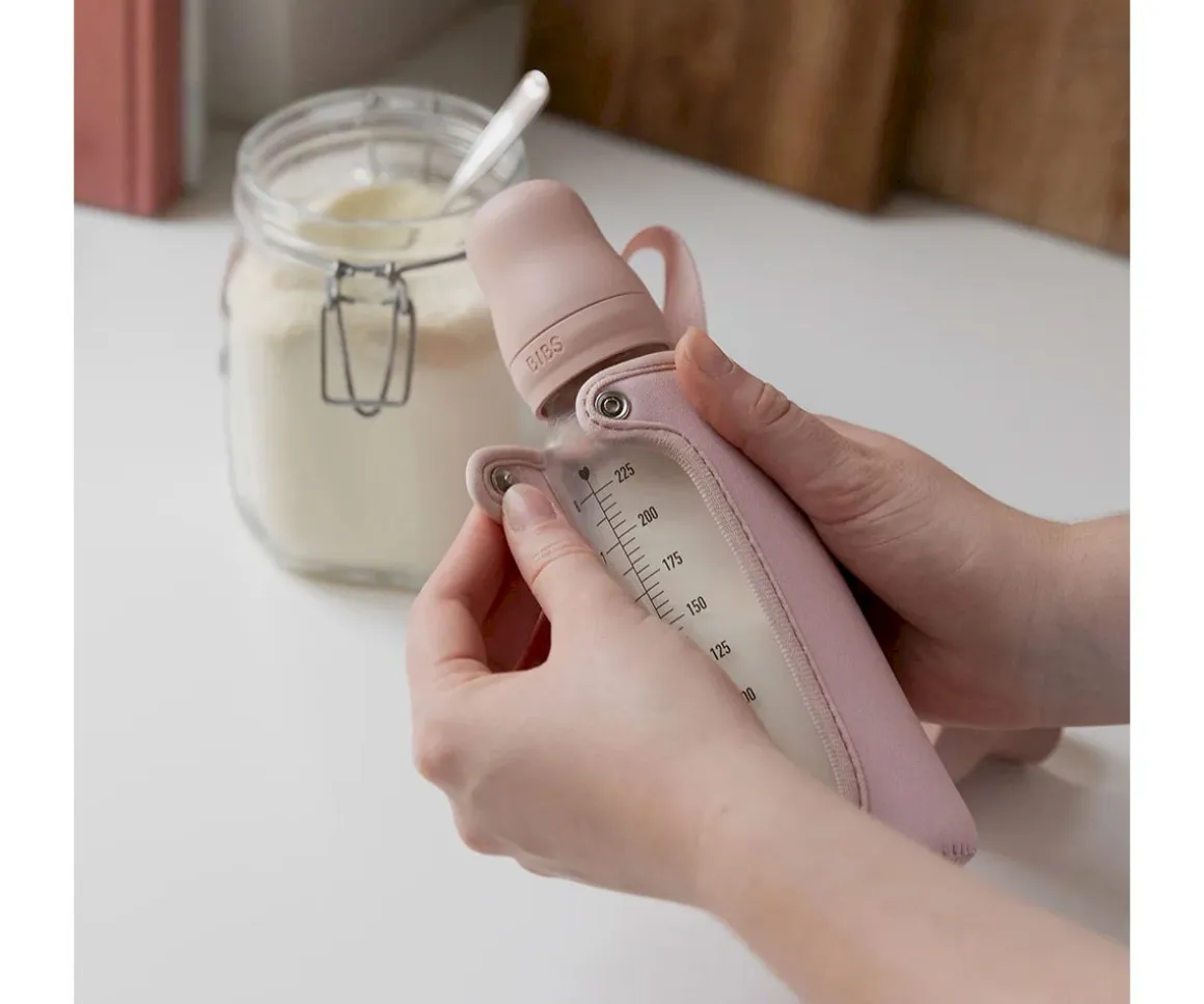 Funda para biberón de neopreno de BIBS que lo protege de golpes, además, tiene una apertura para ver la indicación de medida del biberón y la cantidad que queda.