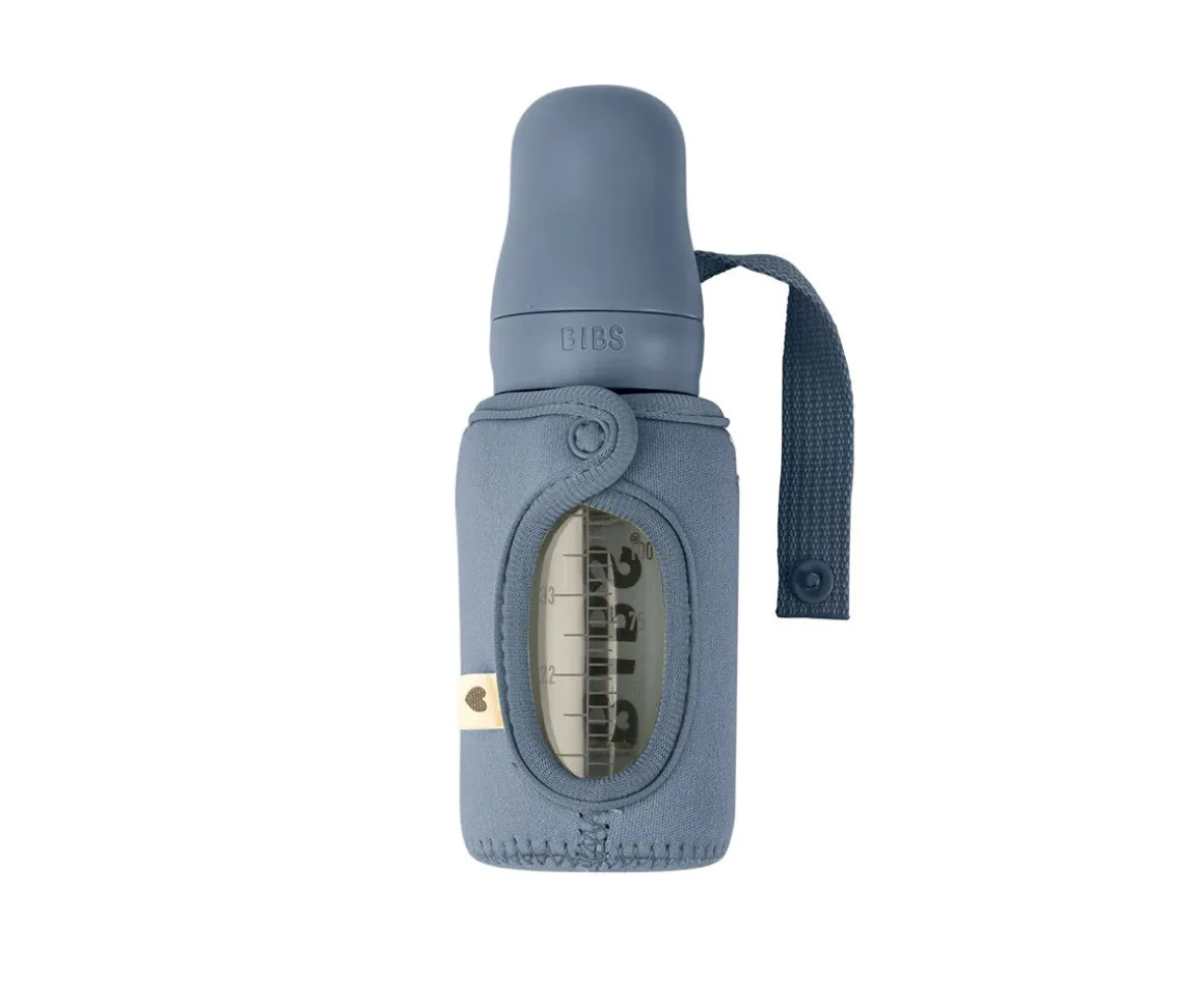 Funda para biberón de neopreno de BIBS que lo protege de golpes, además, tiene una apertura para ver la indicación de medida del biberón y la cantidad que queda.
