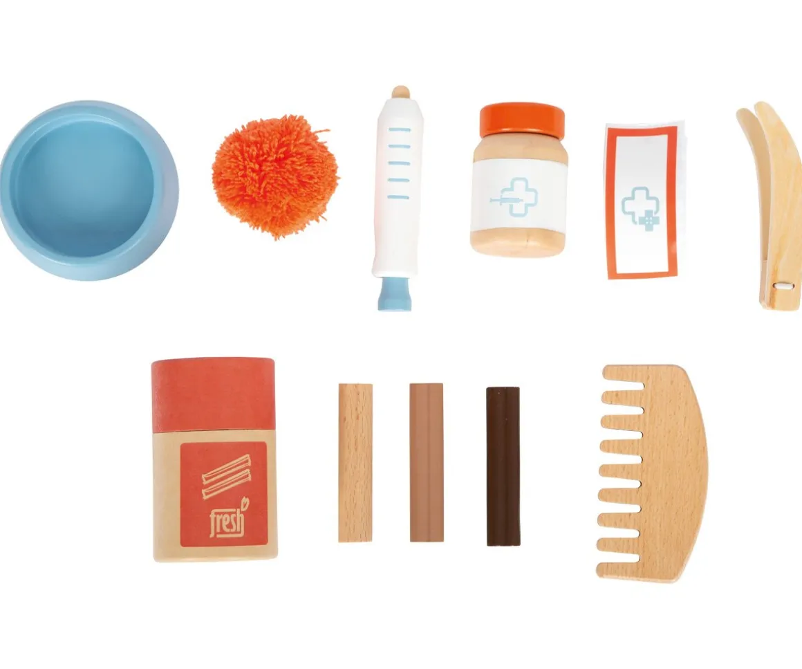 - Los accesorios para el cuidado del gatito son de madera