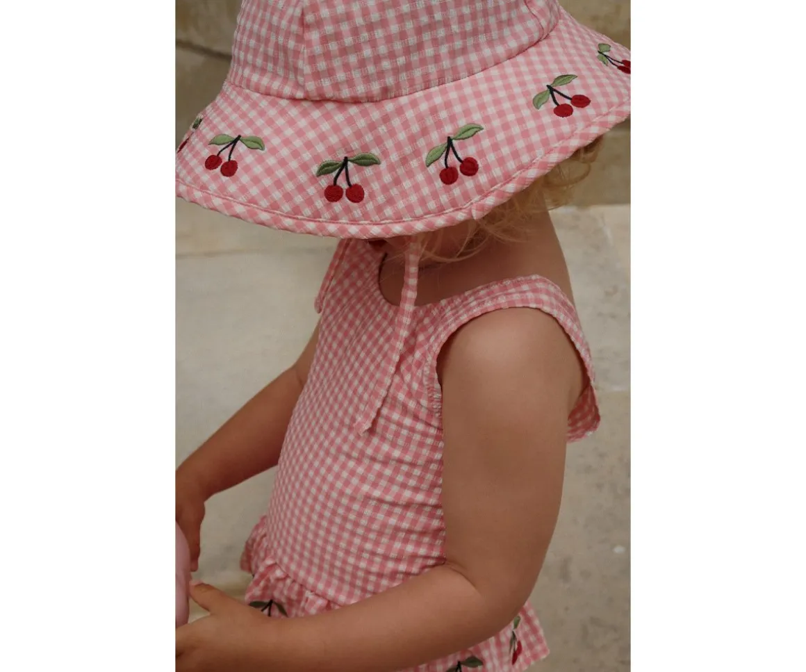 Precioso sombrero de la colección Geranium Pink de Konges Slojd con protección UPF50+ perfecto para llevar en los días soleados y proteger a los peques del sol en la piscina, playa o montaña.