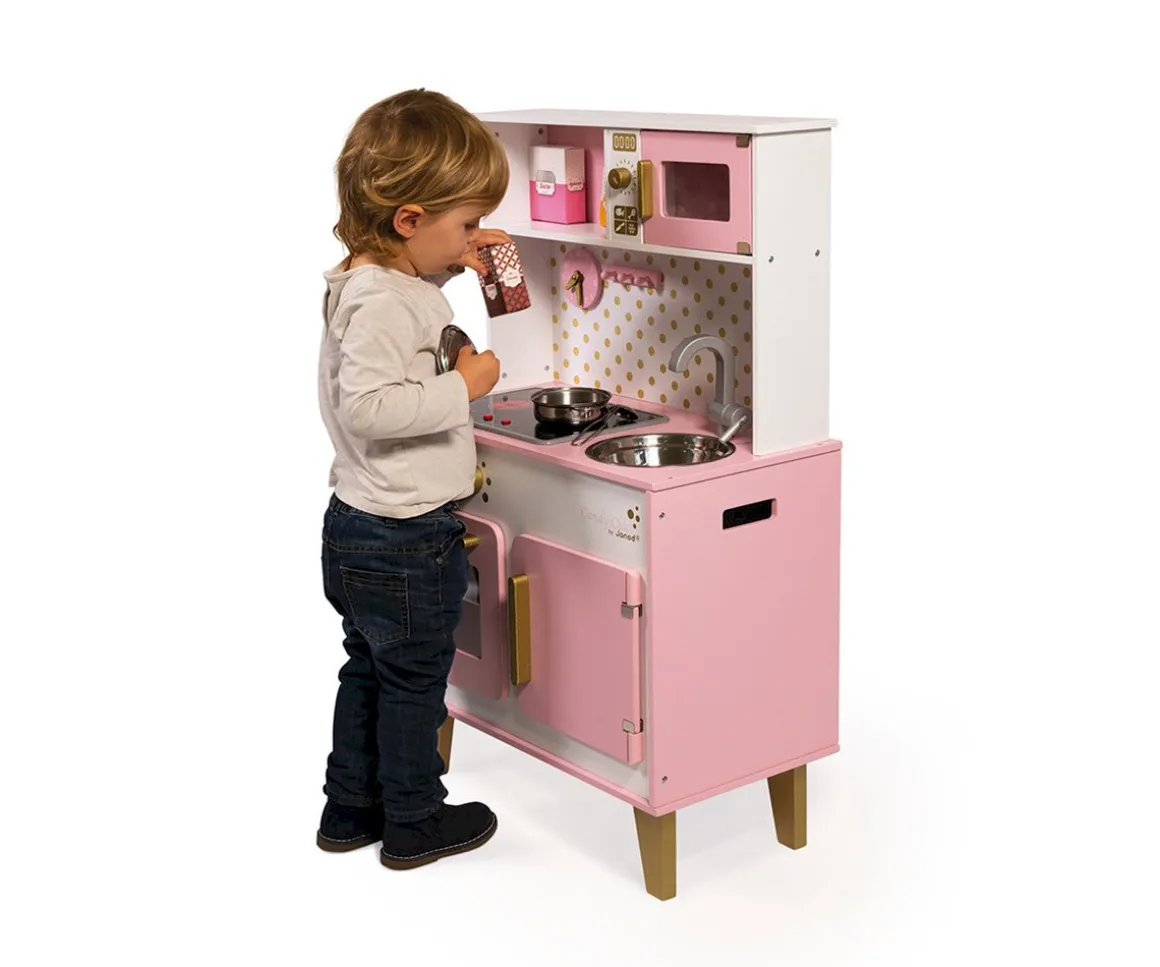 - Esta magnífica cocina totalmente equipada contiene igualmente un horno, un microondas, un armario y un frigorífico con puertas magnéticas, 3 botones giratorios con efectos sonoros, un fregadero de acero inoxidable y un reloj