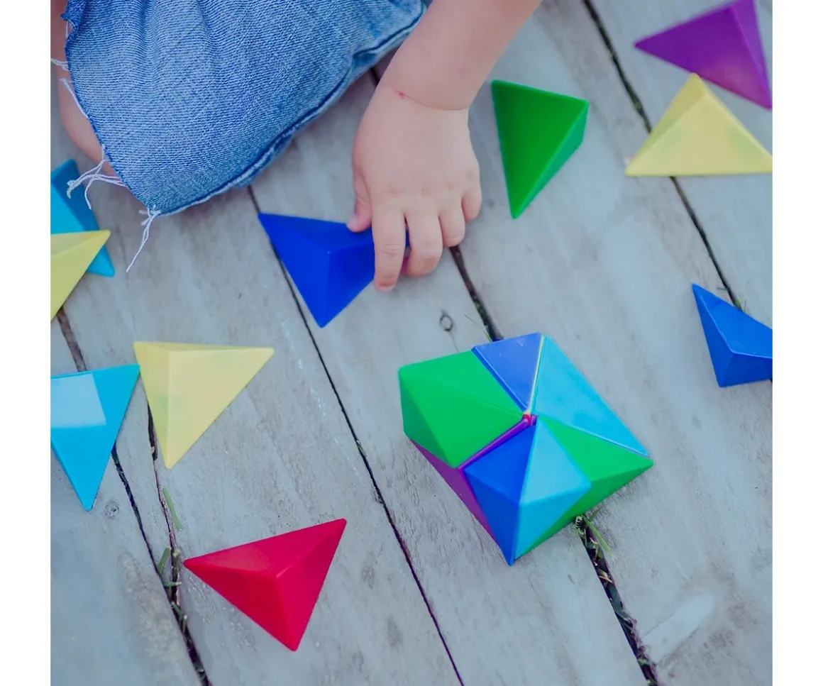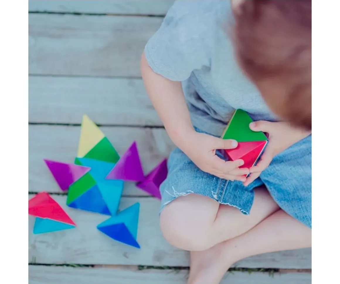 - Incluye: 24 bloques triángulares de colores y 12 tarjetas con desafíos