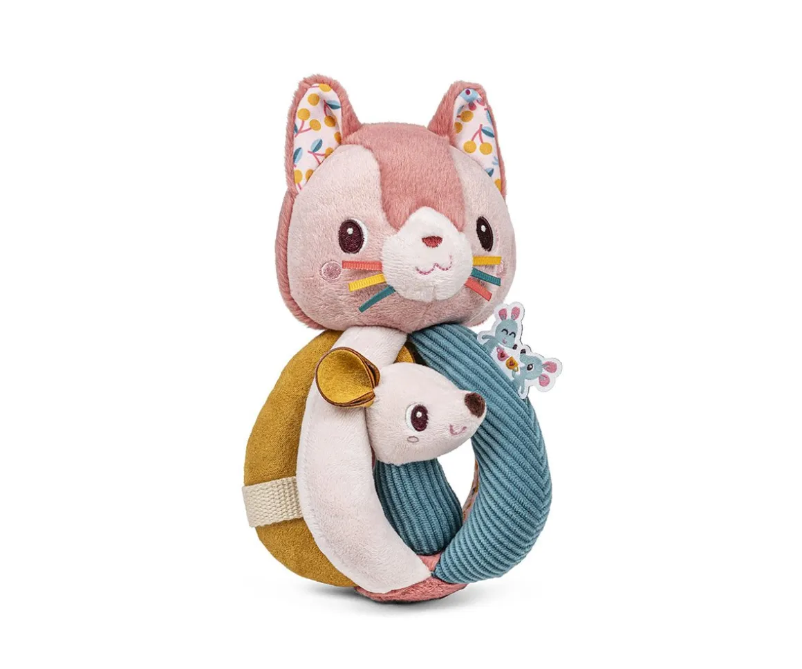 Un sonajero de lo más completo, con 5 asas de diferentes materiales para poder agarrarlo con facilidad y sensorial al tacto. El pequeño ratón quedará sujeto en un asa para que no se pierda.
