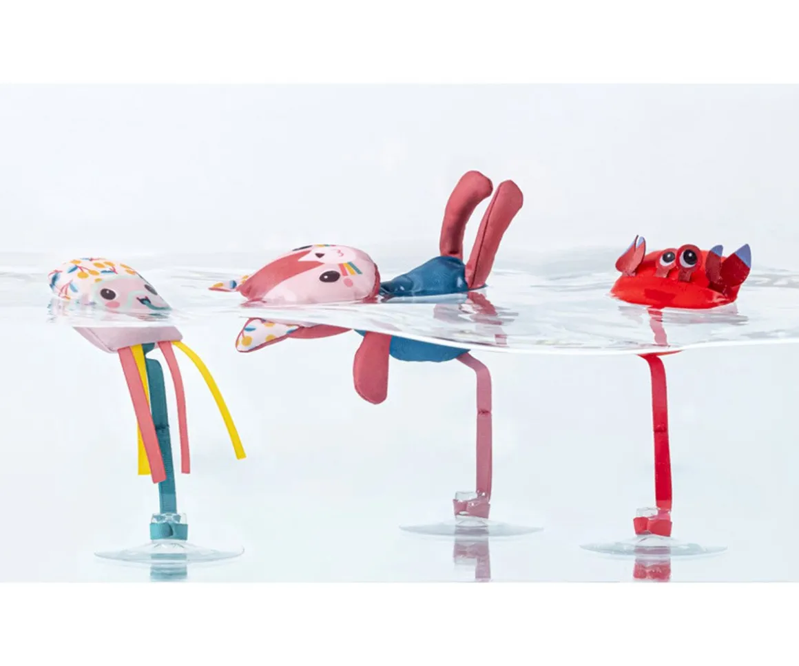 La gatita Jeanne de Lilliputiens y sus dos amigos: un pulpo y un cangrejo, se divierten en el agua y con su ventosa podrán sujetarse en la bañera, en la pared del baño o en el cristal.