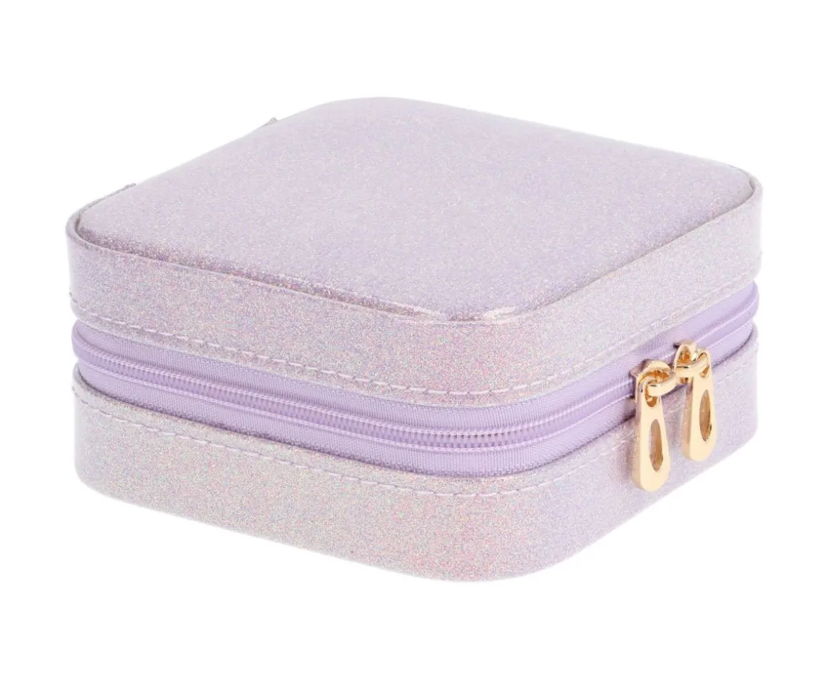 Guarda todos tus cumplementos preferidos bien ordenados en este precioso joyero con acabado de purpurina y cierre de cremallera, gracias a su interior compartimentado.