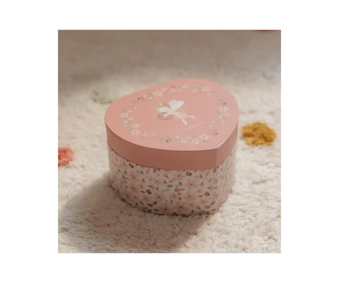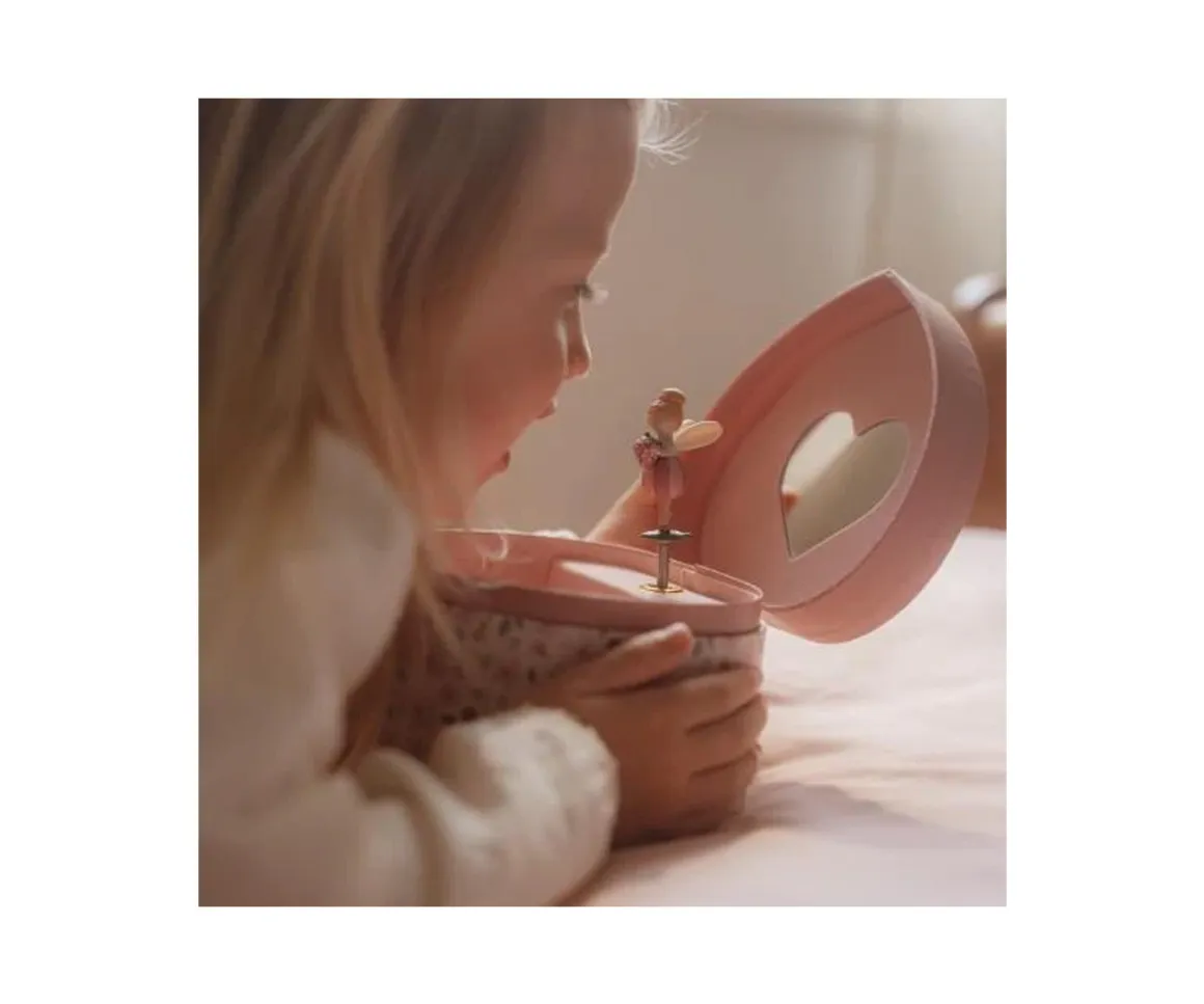 La Caja de Música Joyero de la colección Fairy Garden de Little Dutch es un precioso joyero con forma de corazón, decorado con flores y una encantadora hada. Al abrir la tapa, suena una suave melodía y el hada comienza a girar frente al espejo, creando un momento mágico.