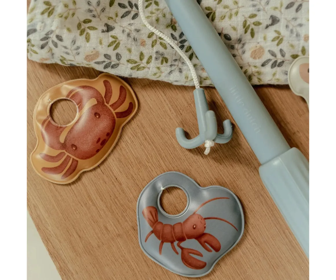 Convierte la hora del baño en una divertida aventura acuática con el juego de pesca azul de Little Dutch. Este encantador set incluye una caña de pescar, una red y ocho coloridas figuras de animales marinos.