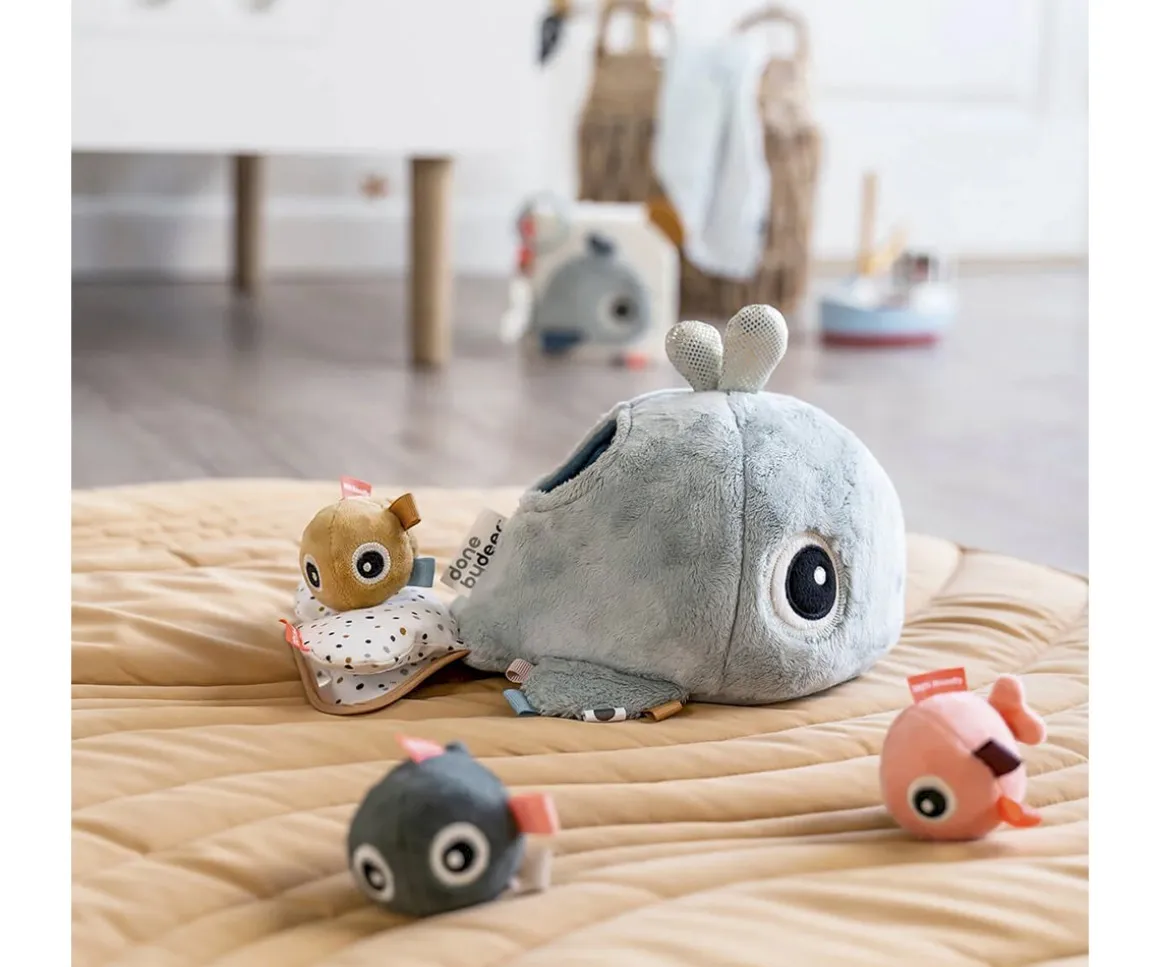 Wally y tres pequeños bebés pececitos con diferentes sonidos y texturas harán que tu peque estimule sus sentidos. Un juguete dónde desarrollará sus habilidades de concentración y coordinación mano – ojo. Los pececitos se pueden introducir en la barriga de esta bonita ballena, descubrirá un espejito en su aleta y sentirá las diferentes texturas que le rodea.