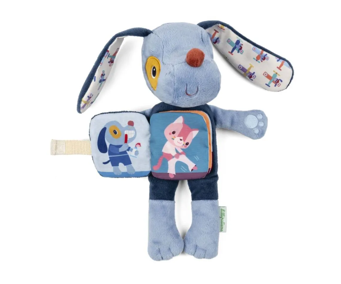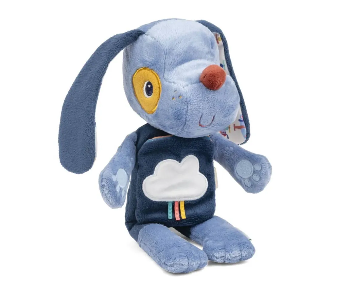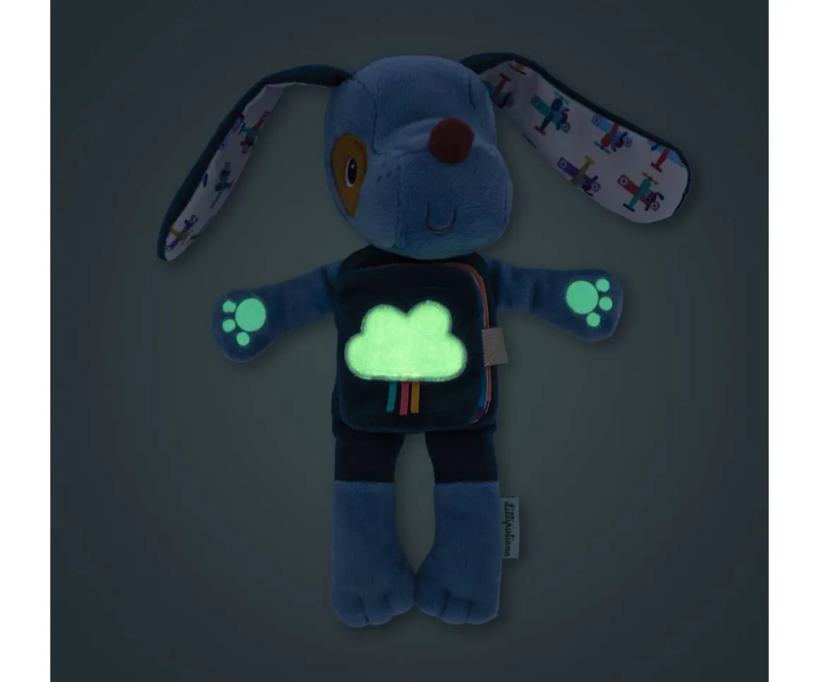Jules, el perro suave y achuchable de Lilliputiens, esconde en su barriga un libro ilustrado que cuenta el ritual de la hora de dormir. Cuando se apaga la luz, una nube y las pequeñas patitas de Jules brillan suavemente para tranquilizar y velar por los dulces sueños.