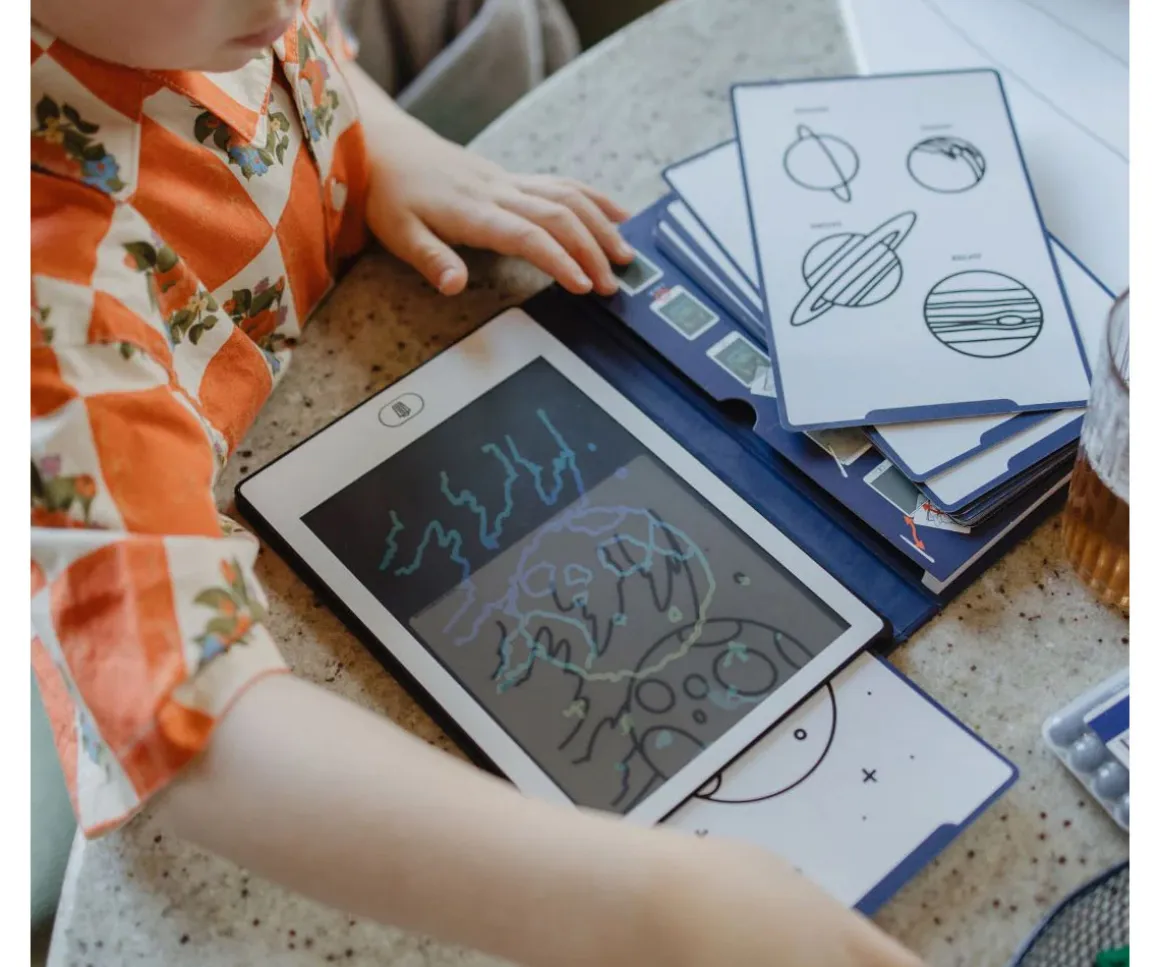 Un original libro de dibujo con pantalla LCD que ofrece 30 ilustraciones de calco inspiradas en la galaxia y el espacio exterior. Ideal para estimular la creatividad y el aprendizaje, permitiendo crear dibujos en cualquier lugar.