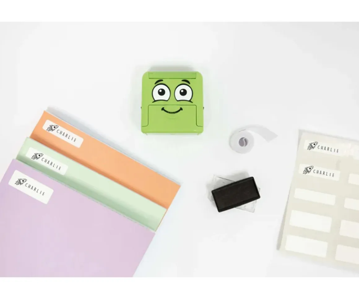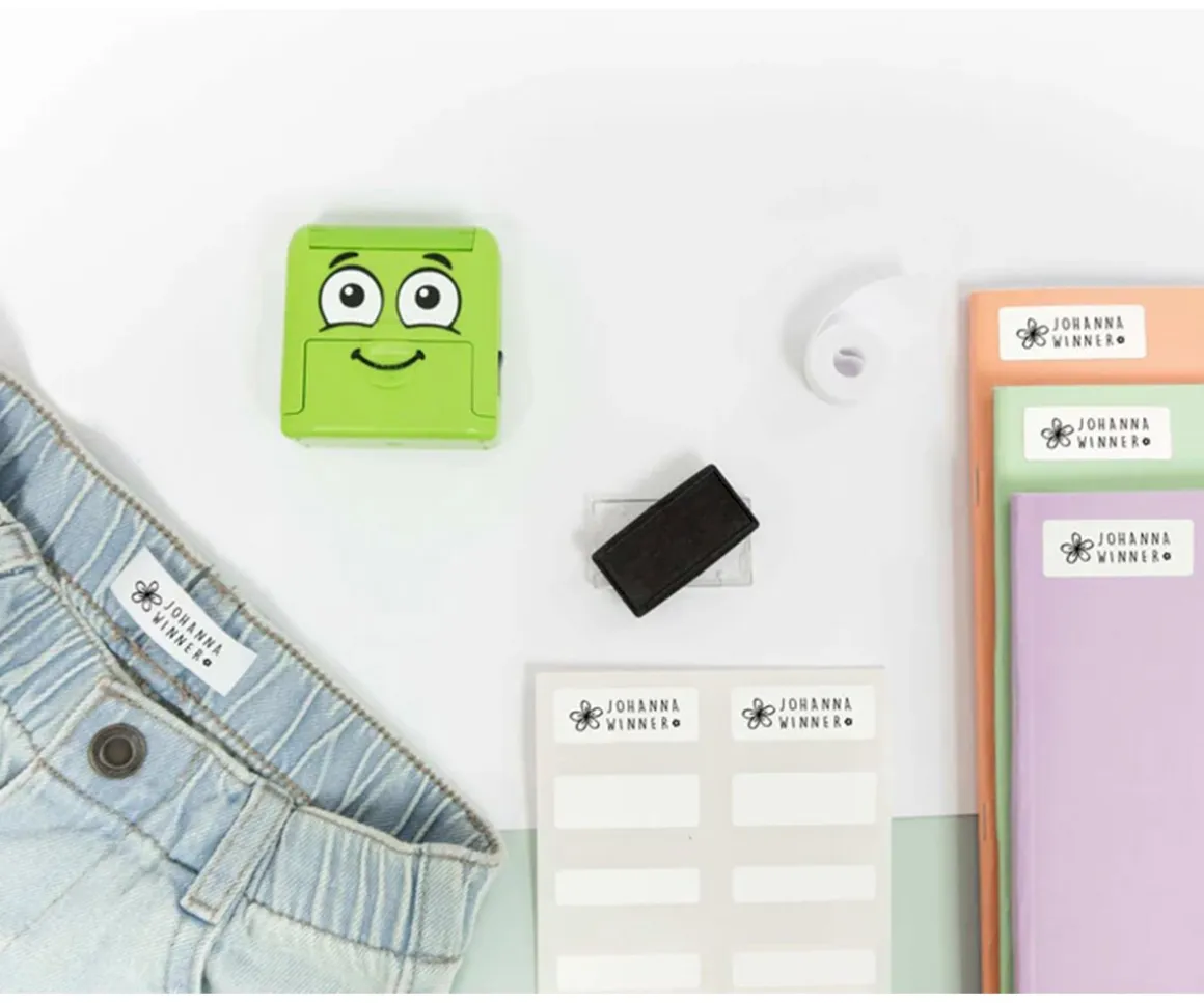 - Incluye: almohadilla de tinta negra (ver tutorial),cinta termoadhesiva de 40 pulgadas para telas oscuras y 40 etiquetas para objetos aptas para lavavajillas