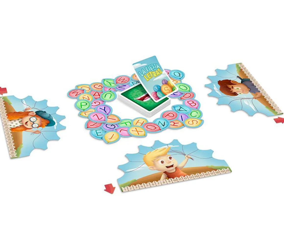 - Incluye: 4 tableros, 4 marcadores de puntos, 88 globos con letras de doble cara, 96 cartas de 3 niveles de dificultad, 1 carta de La Fiesta de las Letras e instrucciones con diferentes modos de juegos