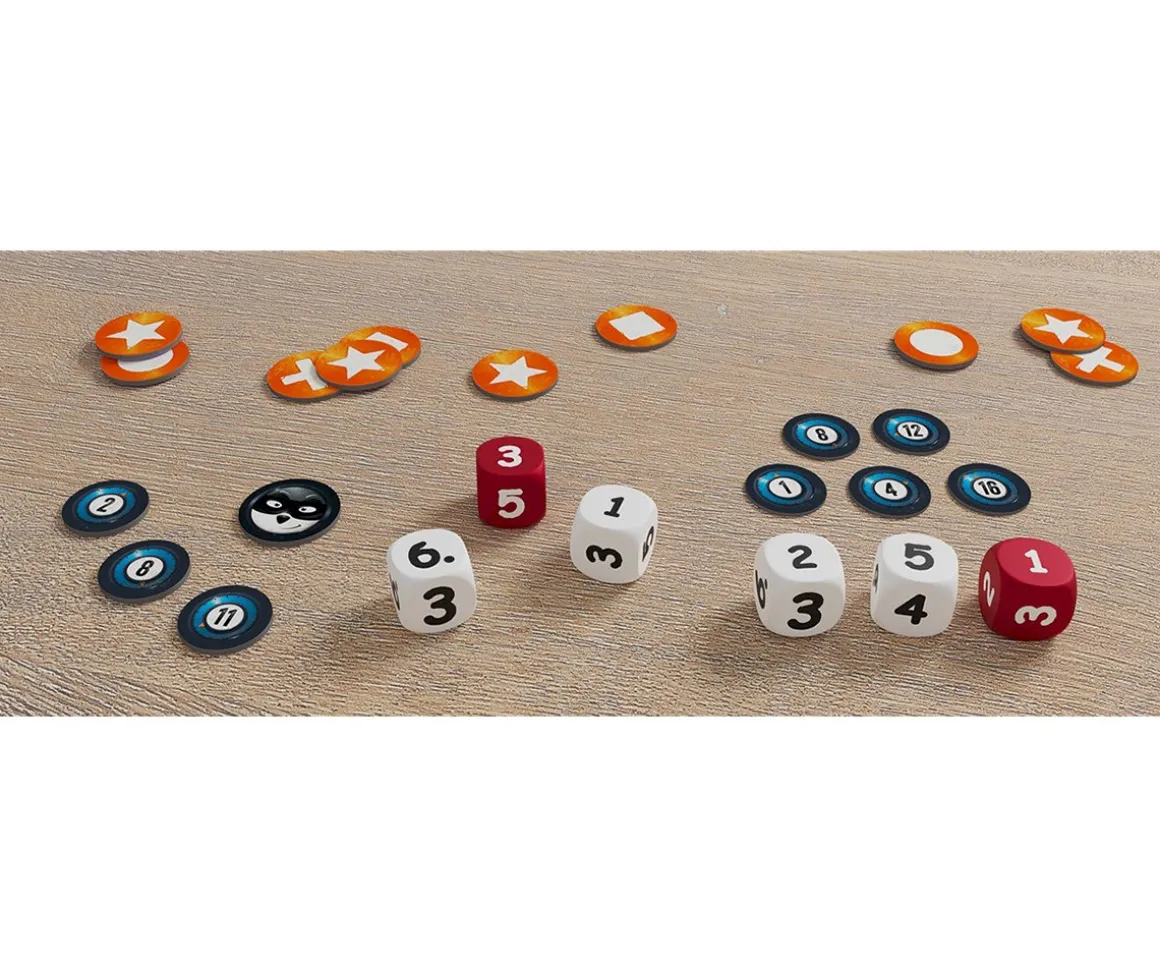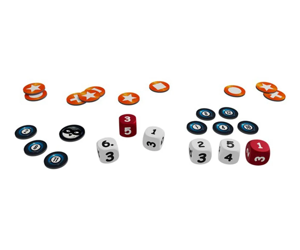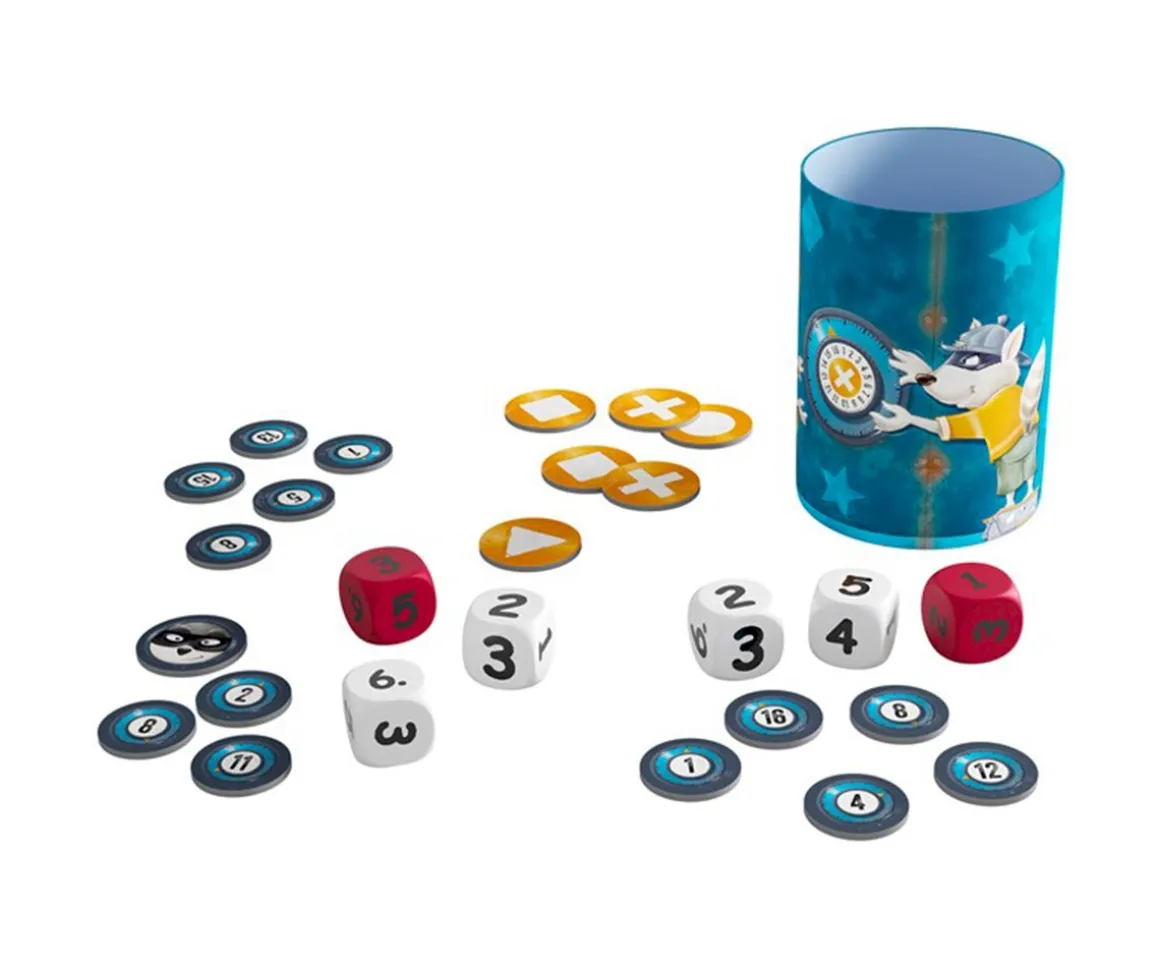 Los divertidos ladrones mapaches se han propuesto robar el contenido de la caja fuerte (cubilete) y para ello deben formar la combinación correcta de la caja fuerte. Para lograrlo se han de combinar los números de los dados y los símbolos de las fichas propias. Quien se deshaga de todas sus fichas abre la caja fuerte y gana partida.