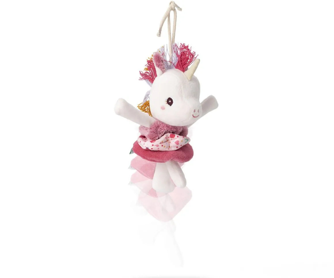Al tirar de las patas, Lena el unicornio sonajero, empieza a bailar alegremente. ¡Qué sensación tan divertida y sorprendente para las manitas de los más pequeños!
