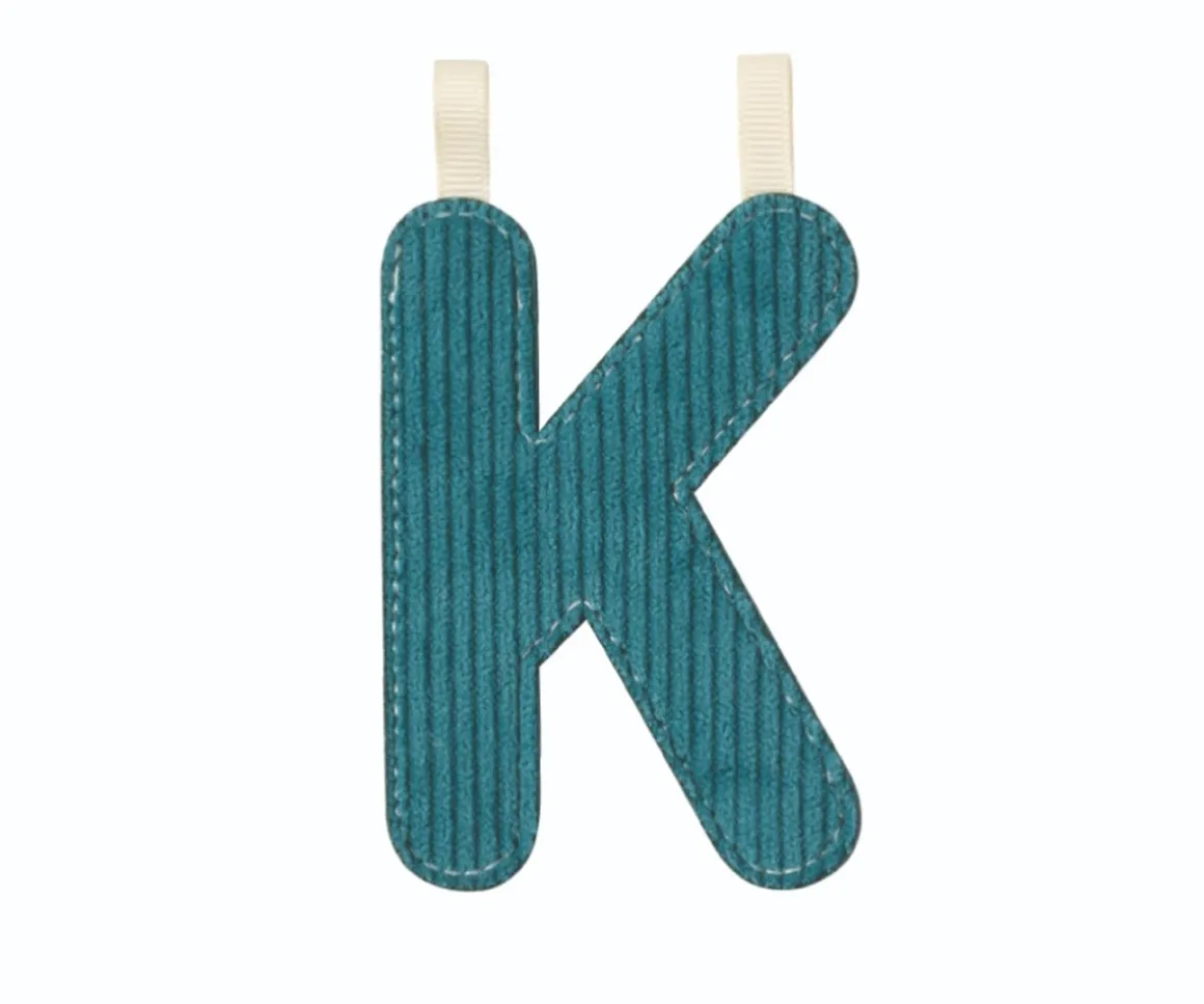 Confeccionada en un precioso color azul verdoso con un suave tacto de pana, esta letra es reversible y tiene una costura fosforescente que brilla en la oscuridad, creando un ambiente encantador y divertido para la habitación.